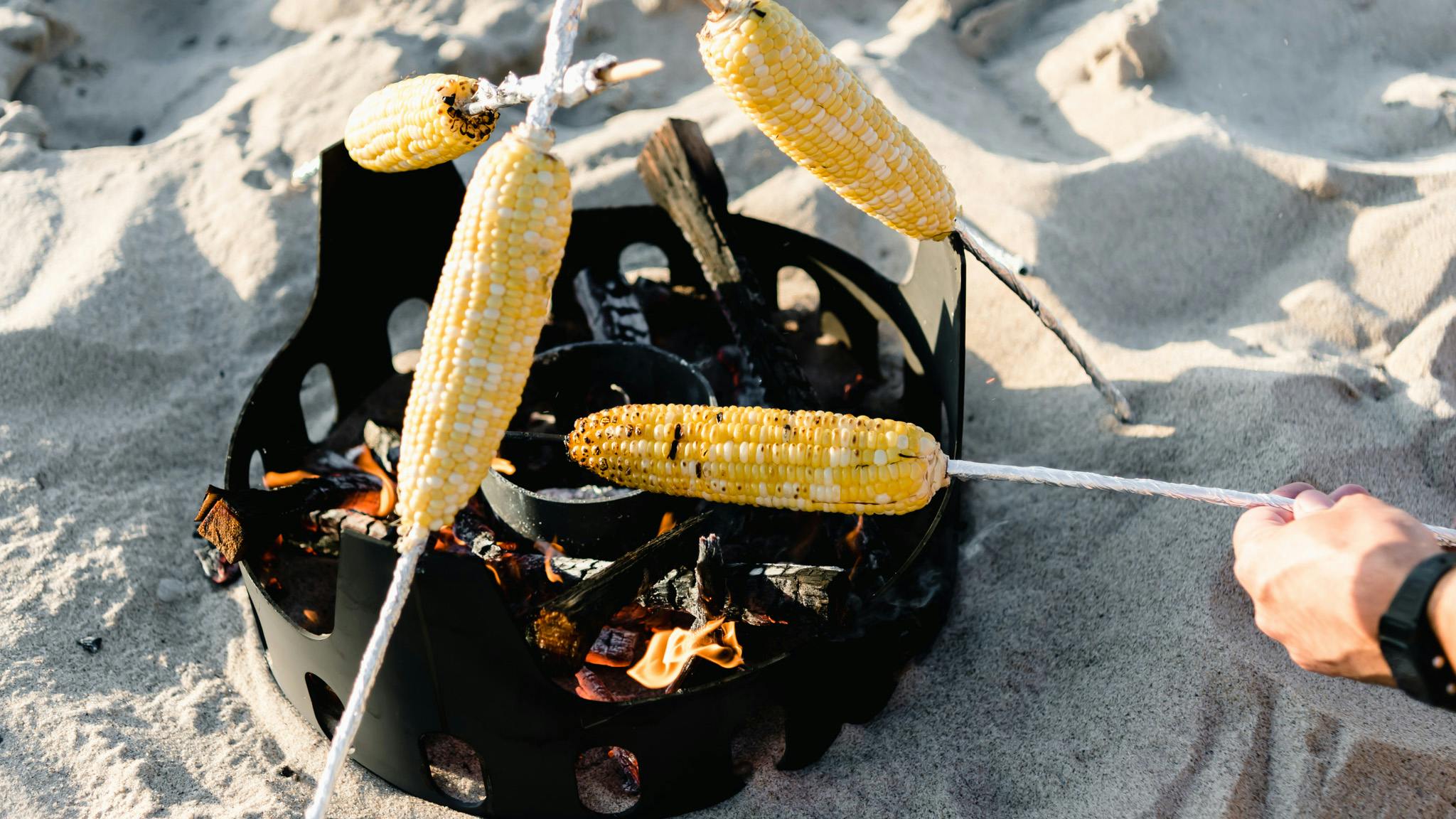 Roasting corn over hardwood while enjoying the magic hour sun at the beach