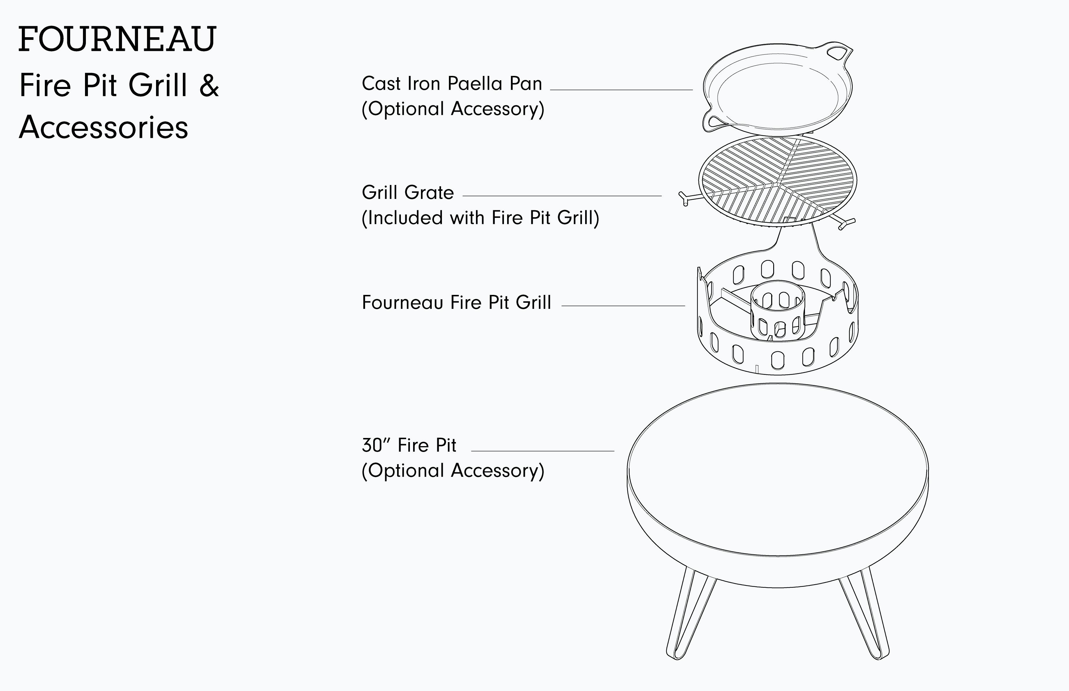 The complete kit includes the Fourneau Fire Pit Grill, the 30" Fire Pit, and the Fourneau Cast Iron Paella Pan. The Fire Pit Grill comes with an oil-seasoned cooking grate. This kit is all you need to turn your yard into a hardwood cooking headquarters. The 30” Fire Pit comes with a cover for protection from the elements, as well as a drain hole.