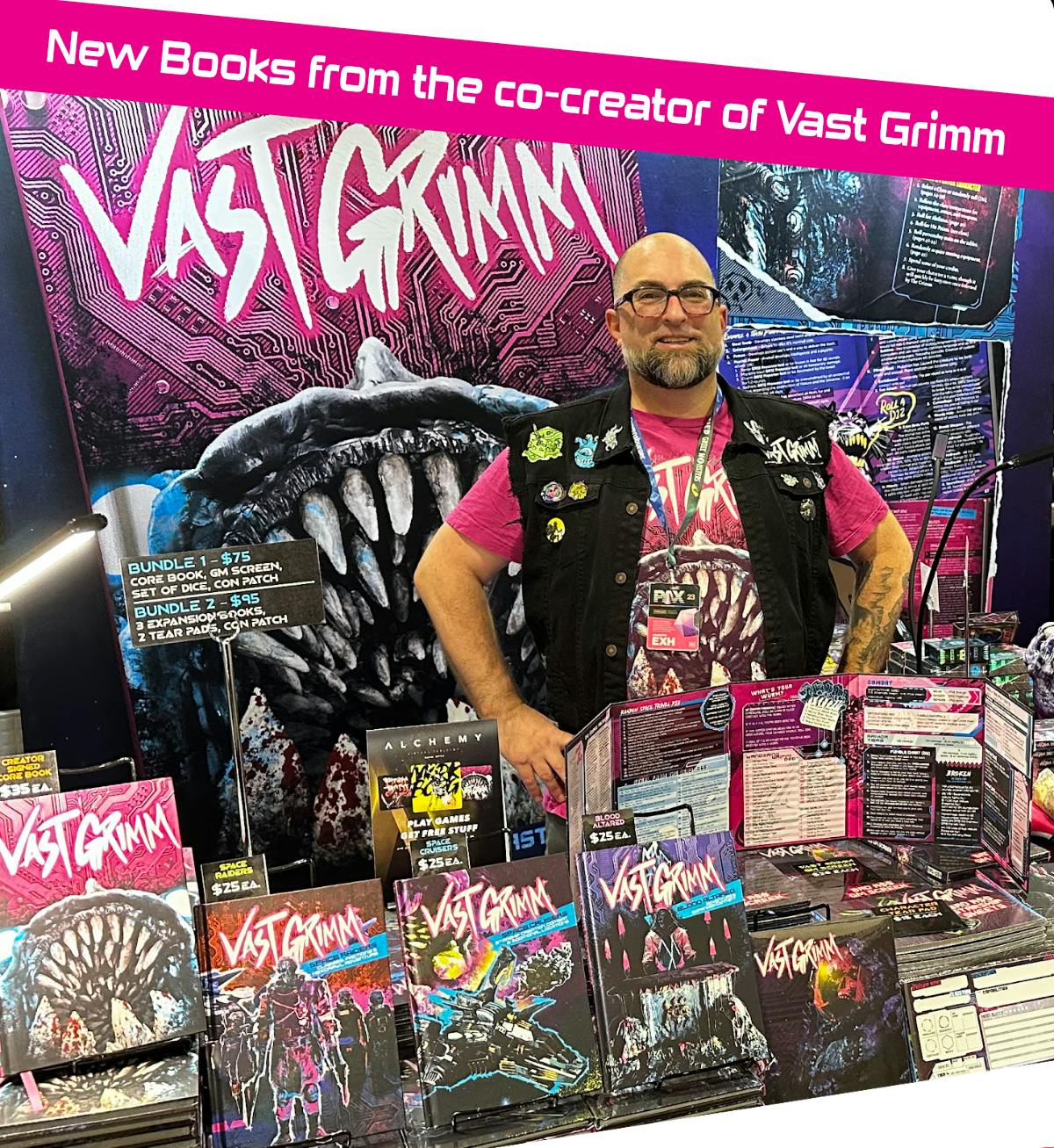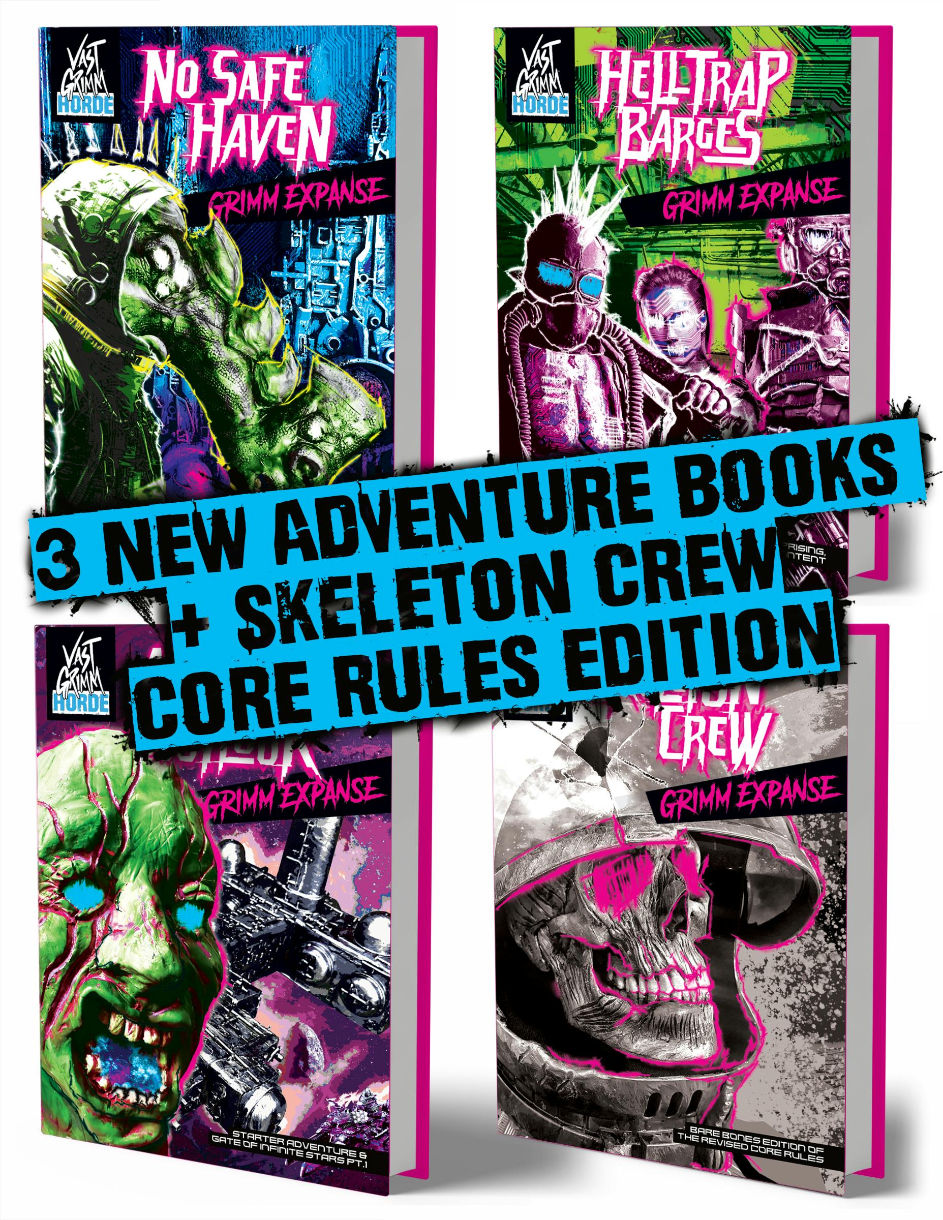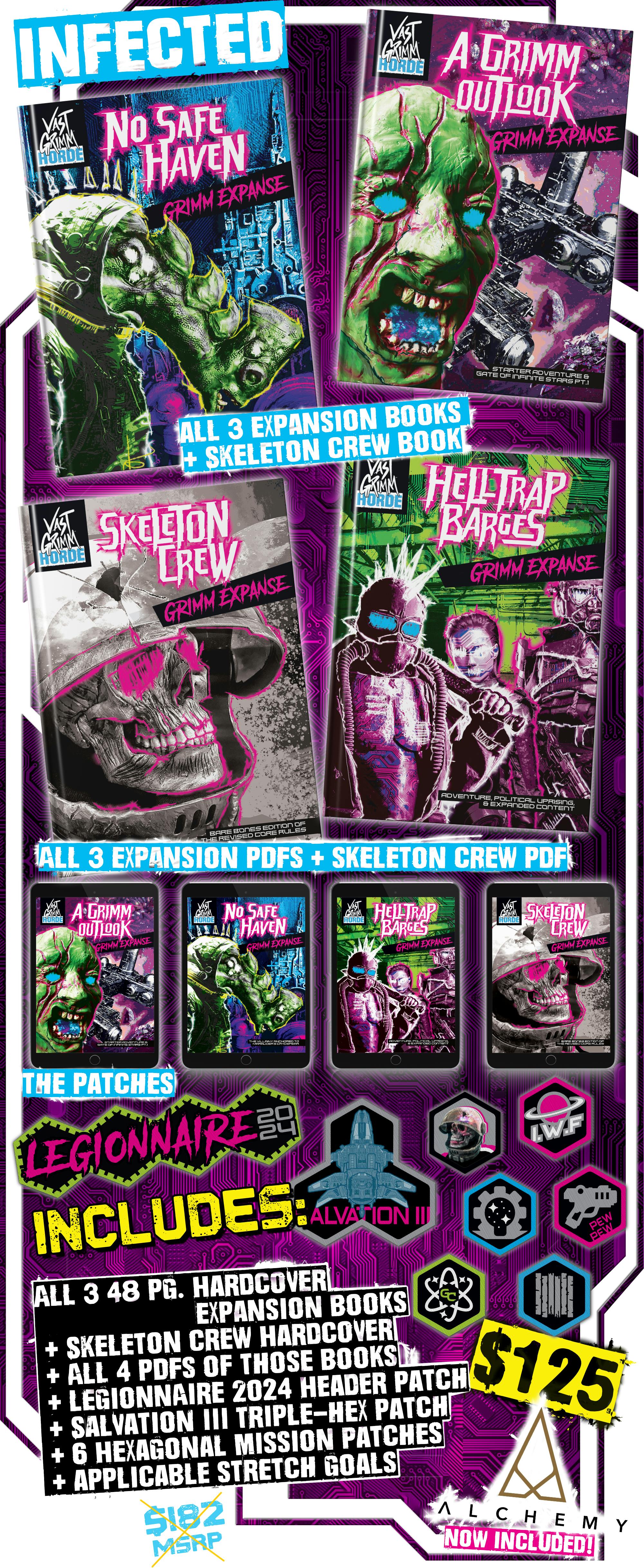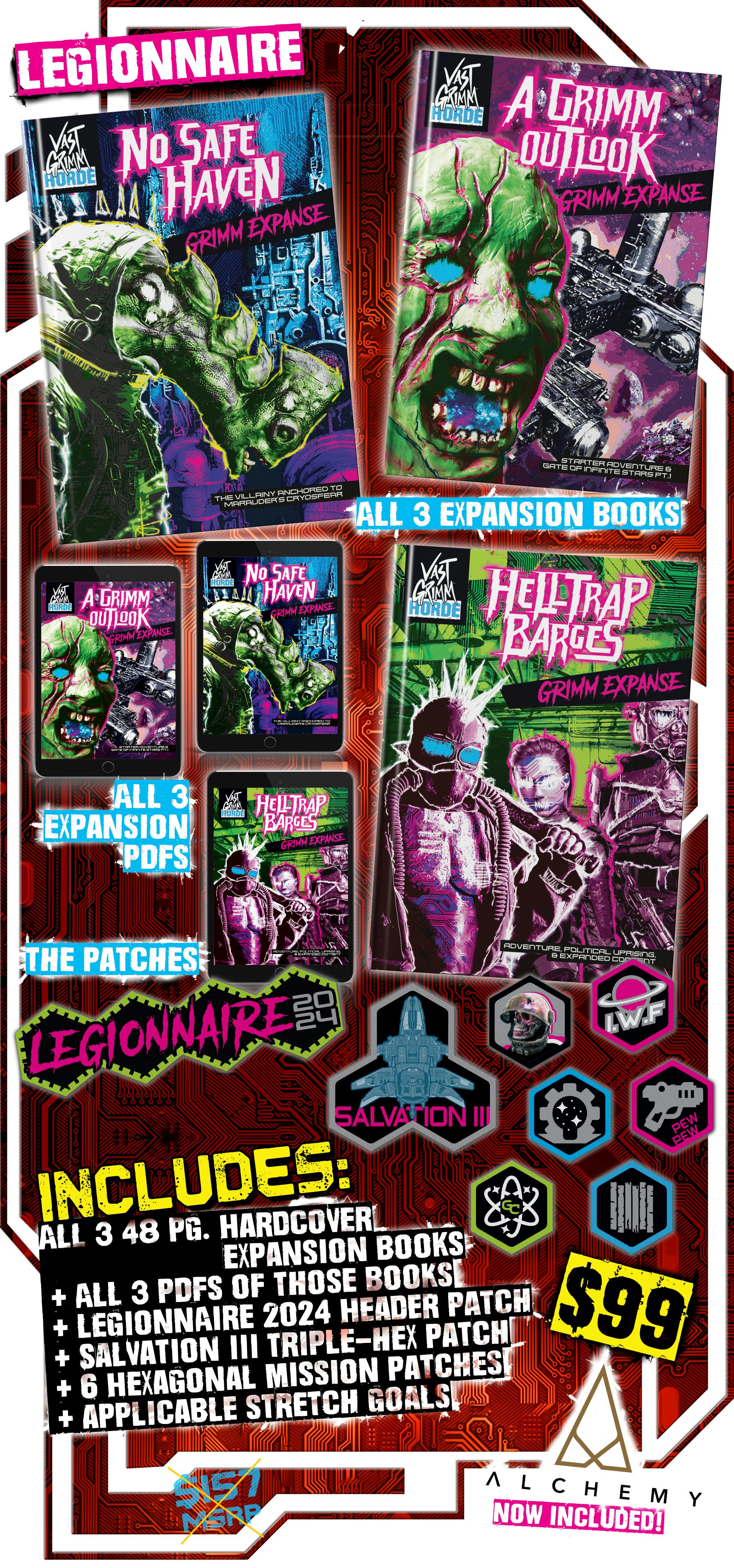 3 new books exploring the locations for Vast Grimm, a bare-bones edition of the re-written core rules, and an array of Legionnaire Patches proving you’re part of OUR LEGION!