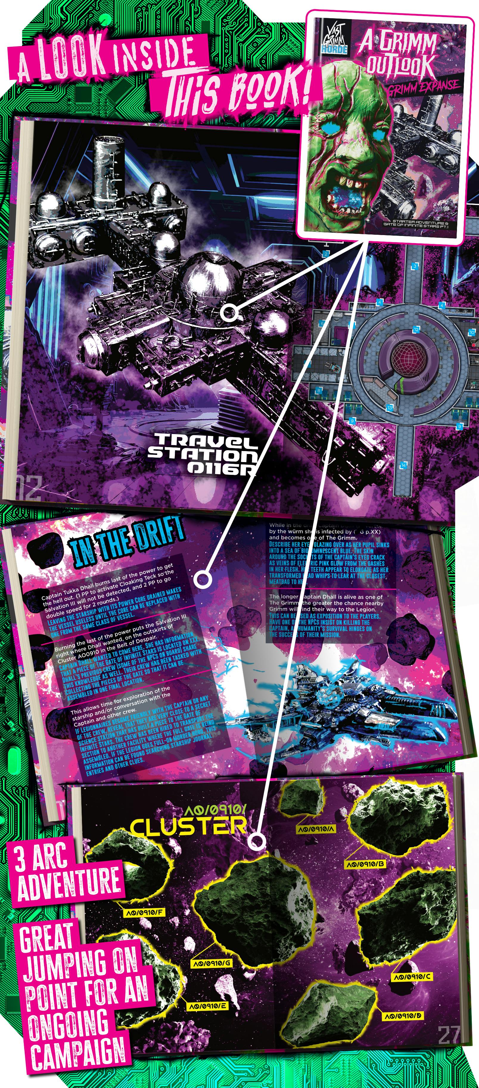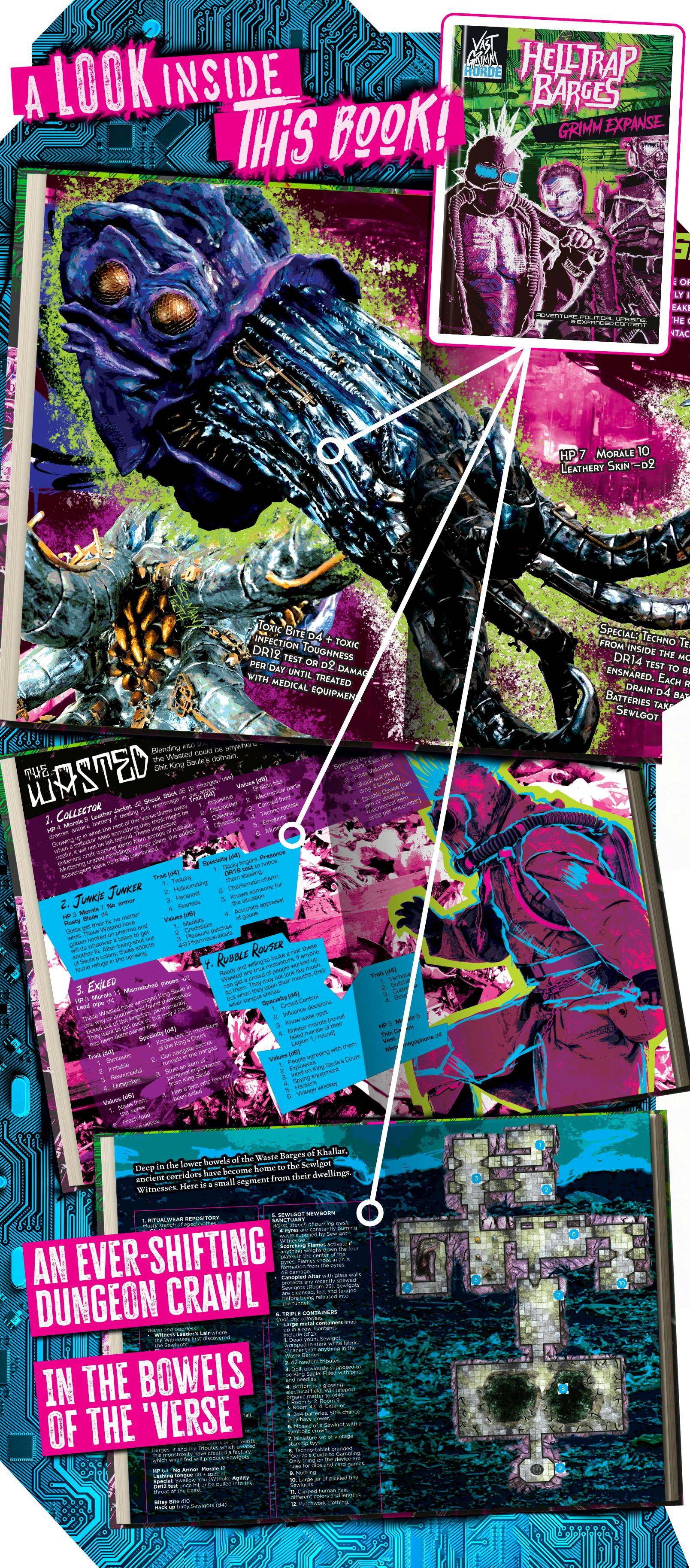 A Grimm Outlook was designed to introduce new players and game masters to the overall vibe of this bizarre, gross, weird, over-the-top science-fantasy setting. Though there are key actions that are inevitable in the timeline, most of the adventure was written to be open-ended; allowing the Legion (player characters) to forge the story’s direction.