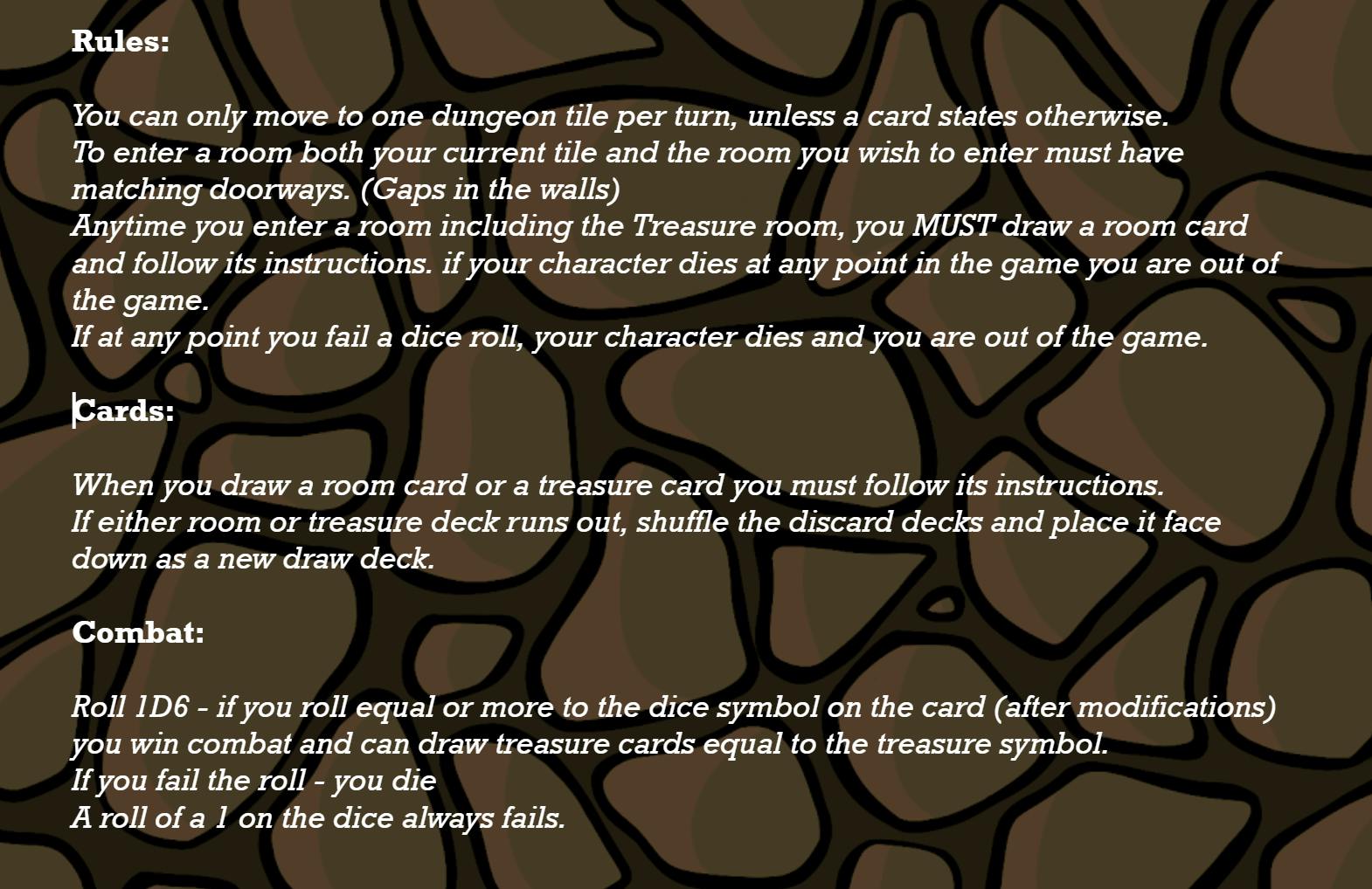 (Side note in regards to the room and treasure cards, i would like most of these cards to be individual so no game is ever truly the same, so if you back this project, any ideas for cards are more than welcome.😁)