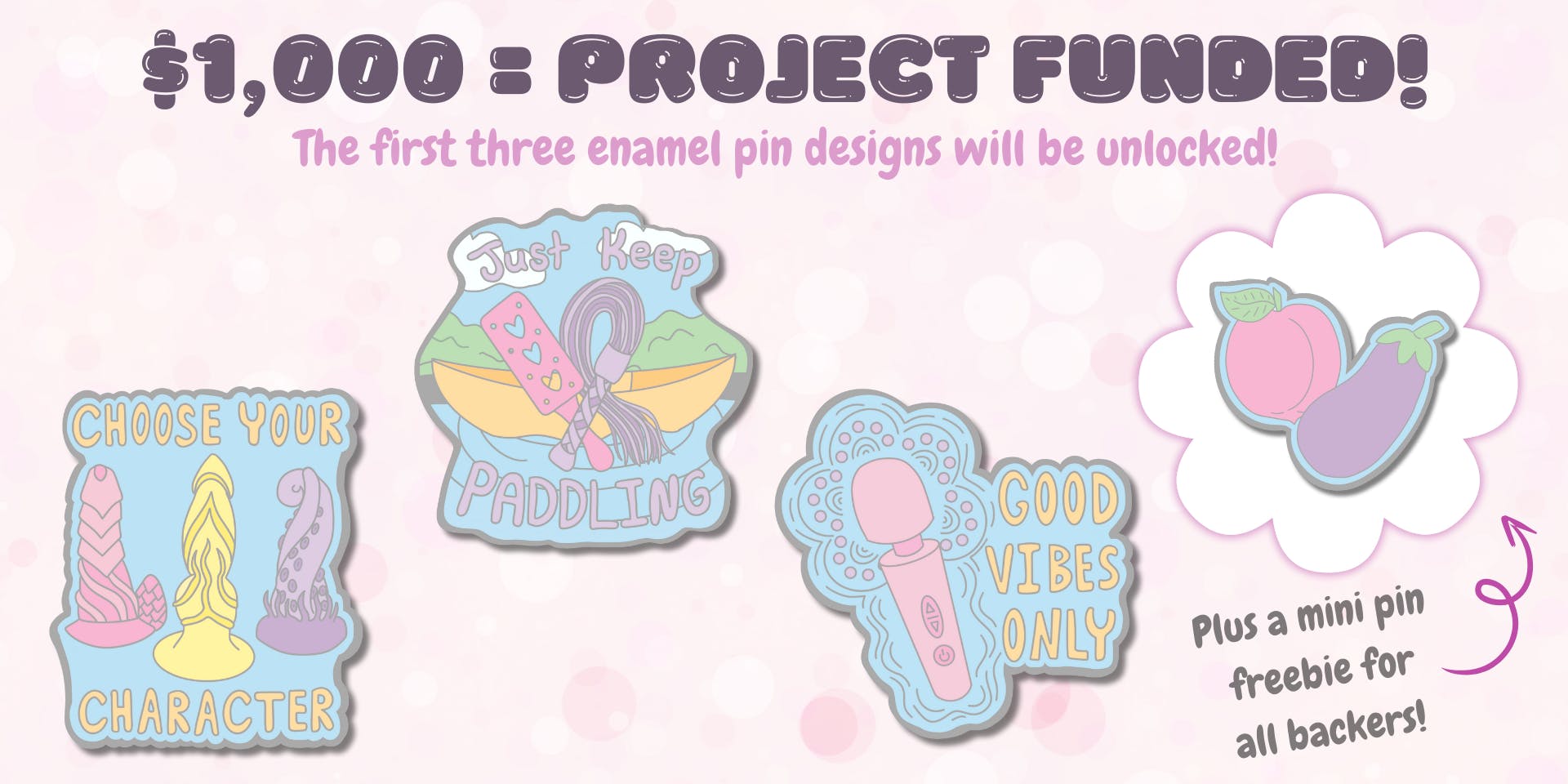 Once the project reaches $1,000 it will be funded and the first three enamel pin designs will be unlocked. Each backer will also receive a mini pin of the peach and eggplant design as a freebie!