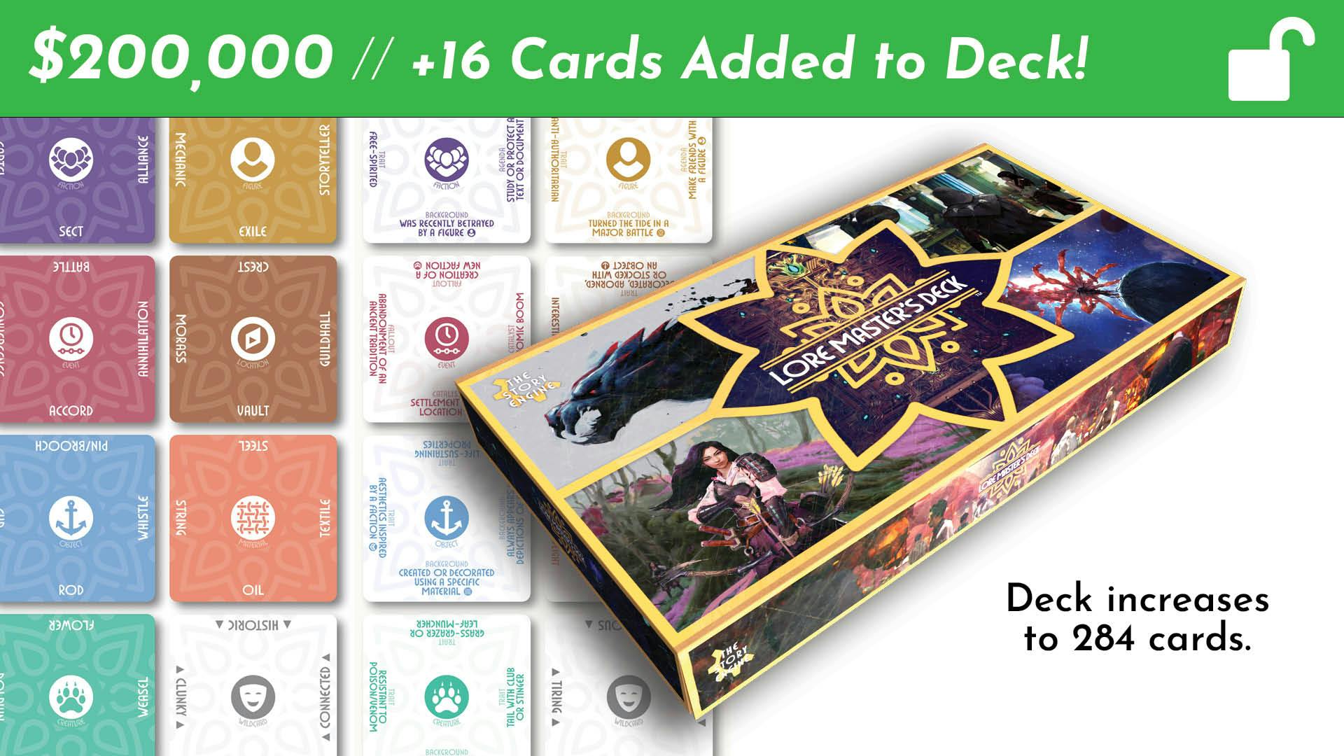 This campaign introduces 5 expansions for Lore Master's Deck, each of which can be unlocked through Community Achievements (aka Stretch Goals).