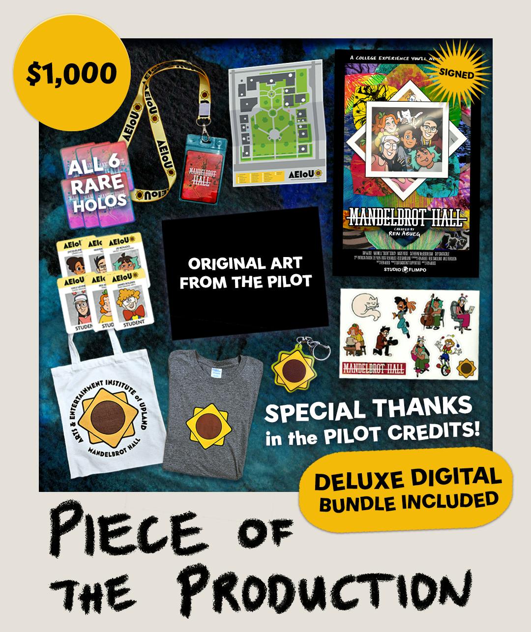 $1000 (20 slots) - Piece of the Production. Receive an original piece of production art, top donor special thanks in the credits, all physical merch (including signed poster + all trading cards), and all digital merch.