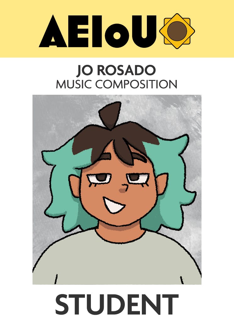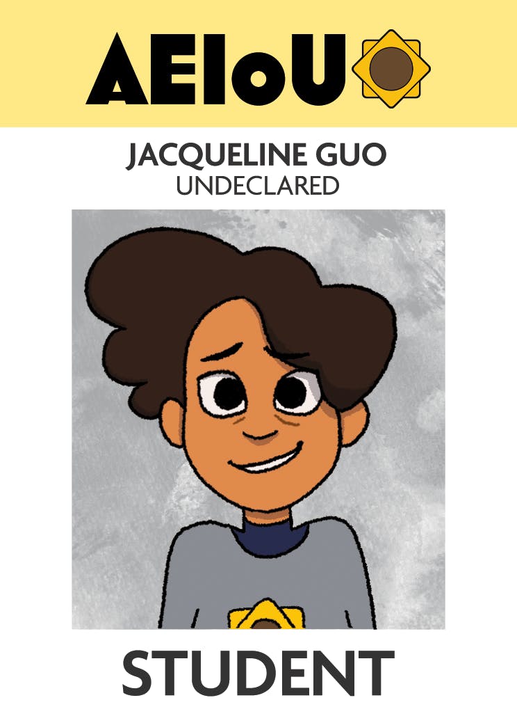 Secluded in sunny Southern California, the Arts and Entertainment Institute of Upland (AEIOU) boasts a student body of idiosyncratic creatives. Painters and game designers mingle around the stone fountain at the center of a grassy radial campus. Animators and composers spend long hours hunched over computers while actors and singers perform their hearts out in a neighboring building. Jackie tends to frequent the dusty campus library and hangs around in empty studios - or really, wherever someone else tells her to go.