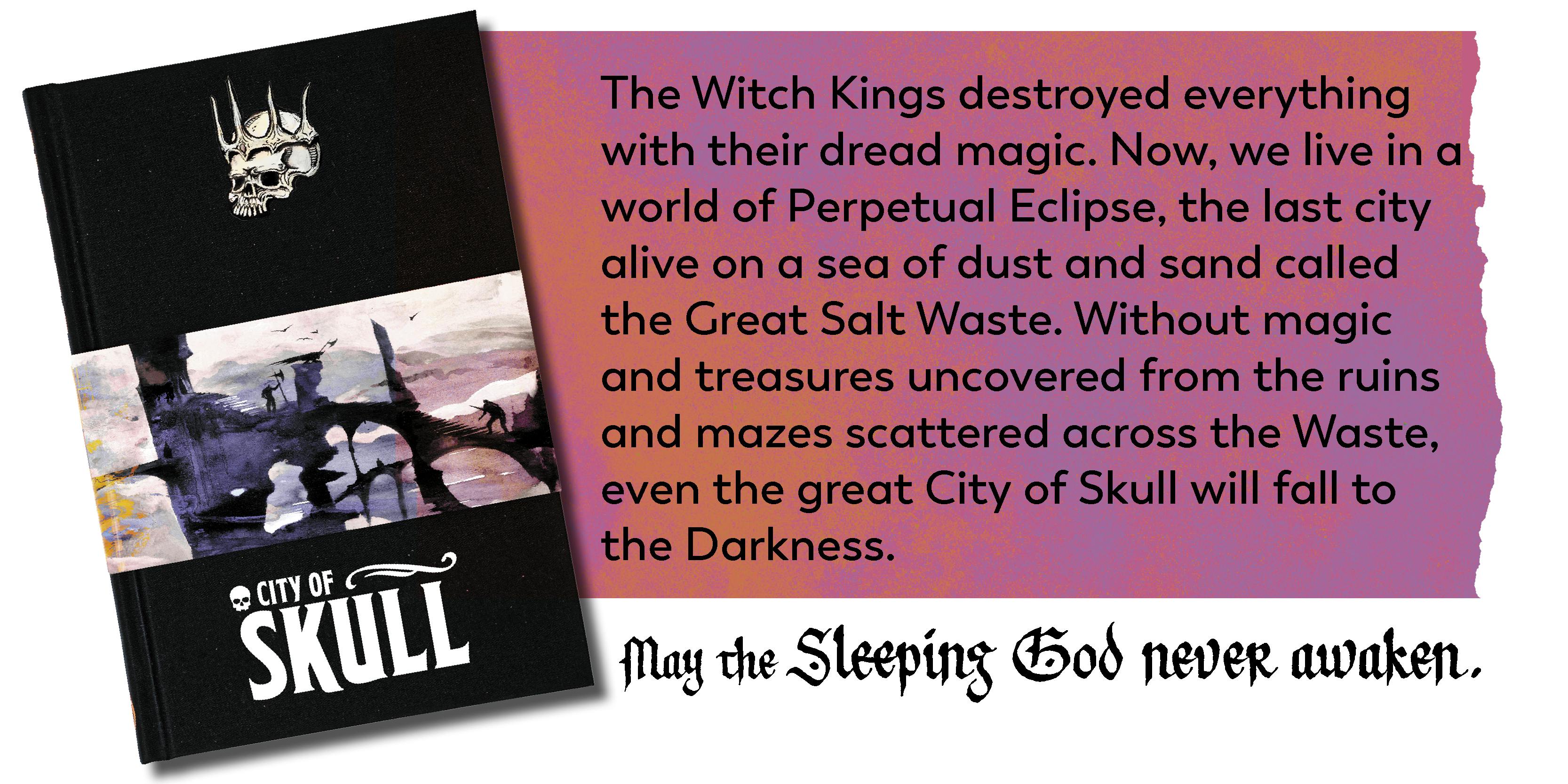 A guide to living in Skull, the Last City. Learn the religion, politics, guilds, and lore of a unique and exciting adventuring world. Plus Hazards, Monsters, and Broken Gods of the Salt Waste.
