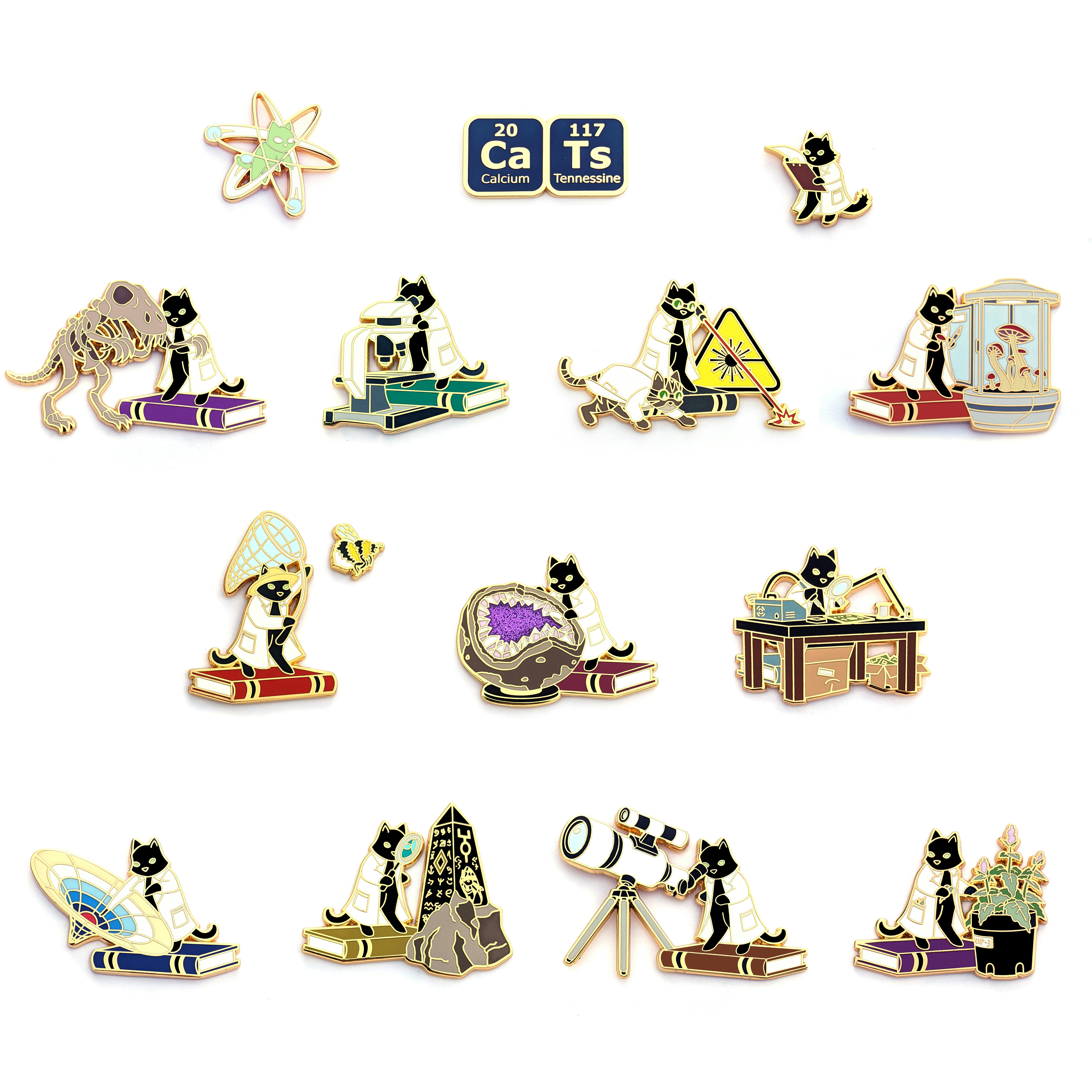 Pin designs from the original Cats Doing Science campaign.