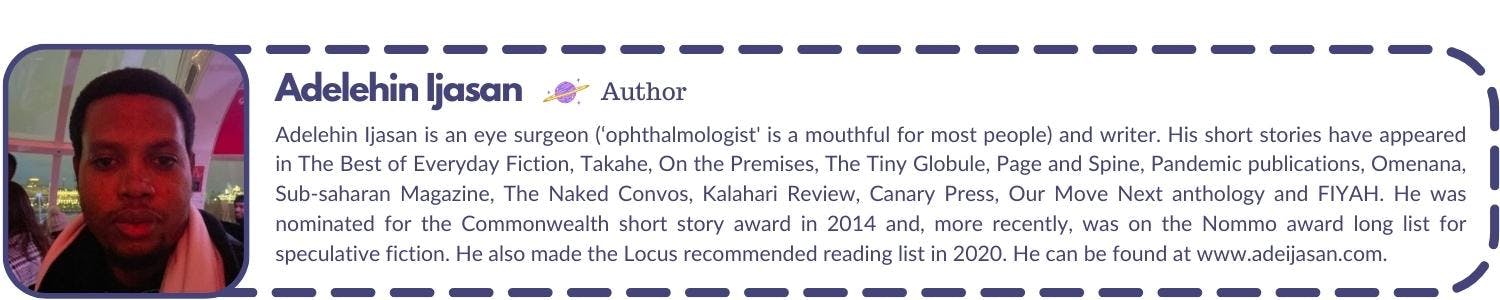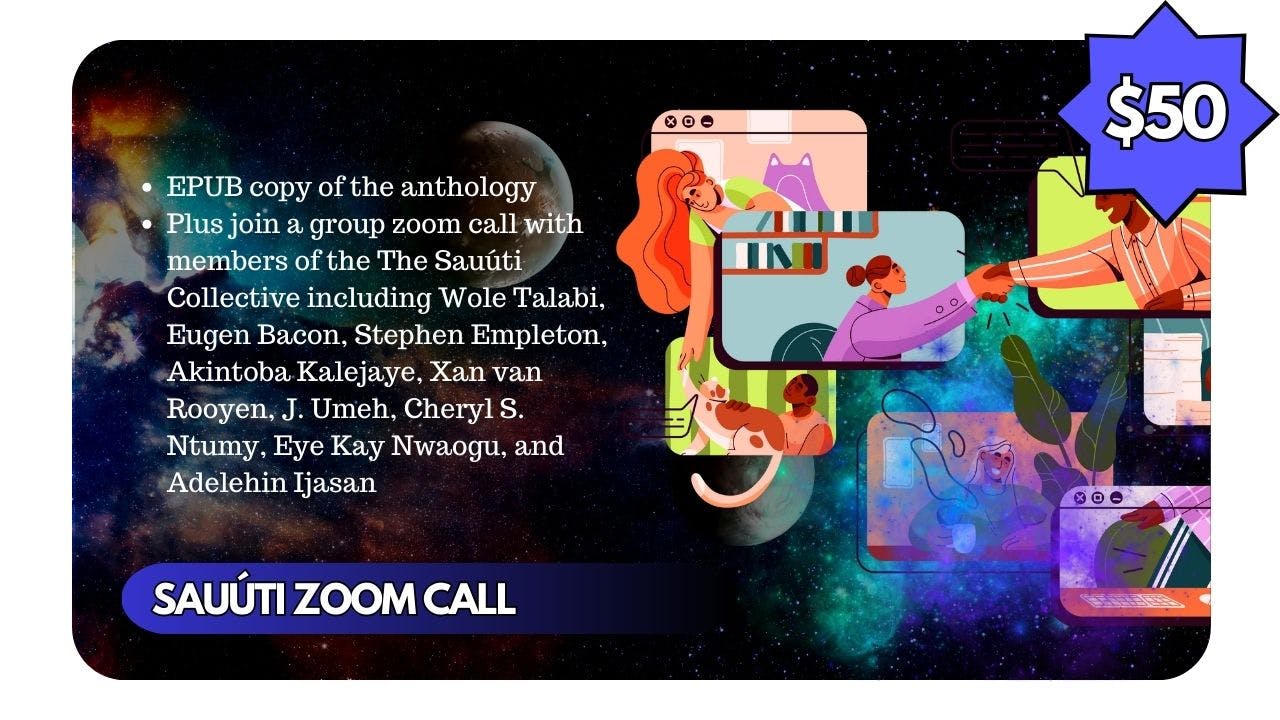 Get an EPUB copy of the anthology and the cover art digital wallpaper. Plus join a group video call with members of the The Sauúti collective including Wole Talabi, Eugen Bacon, Stephen Empleton, Akintoba Kalejaye, Xan van Rooyen, J. Umeh, Cheryl S. Ntumy, Eye Kay Nwaogu, and Adelehin Ijasan.