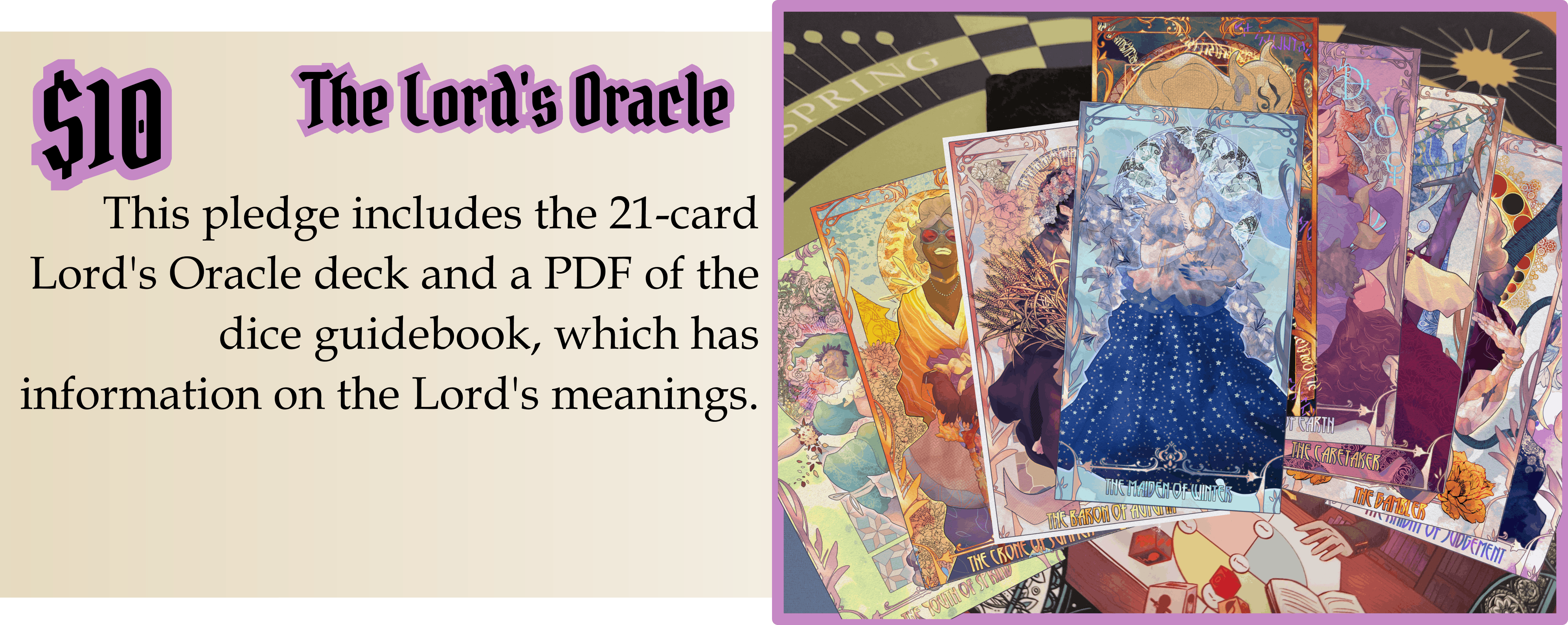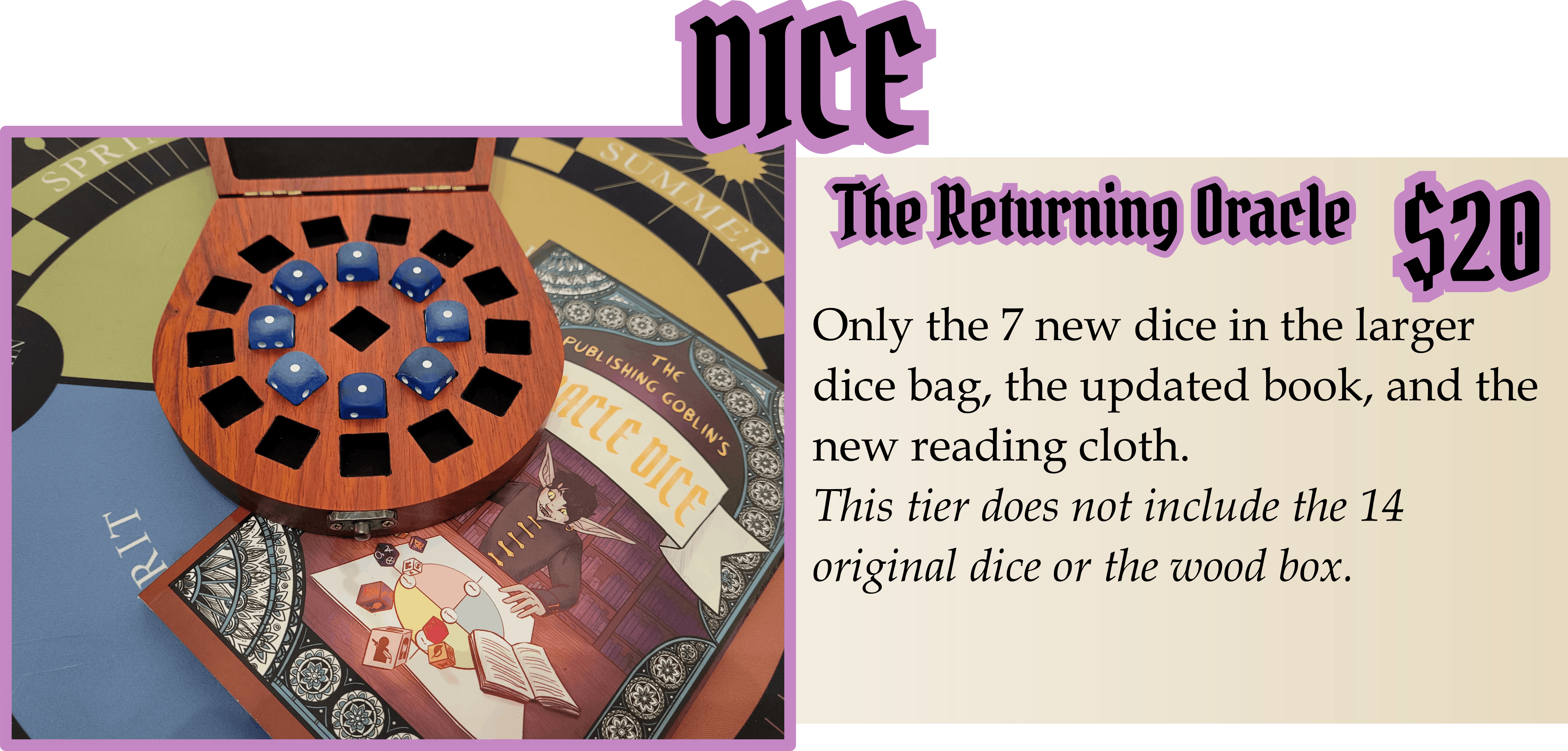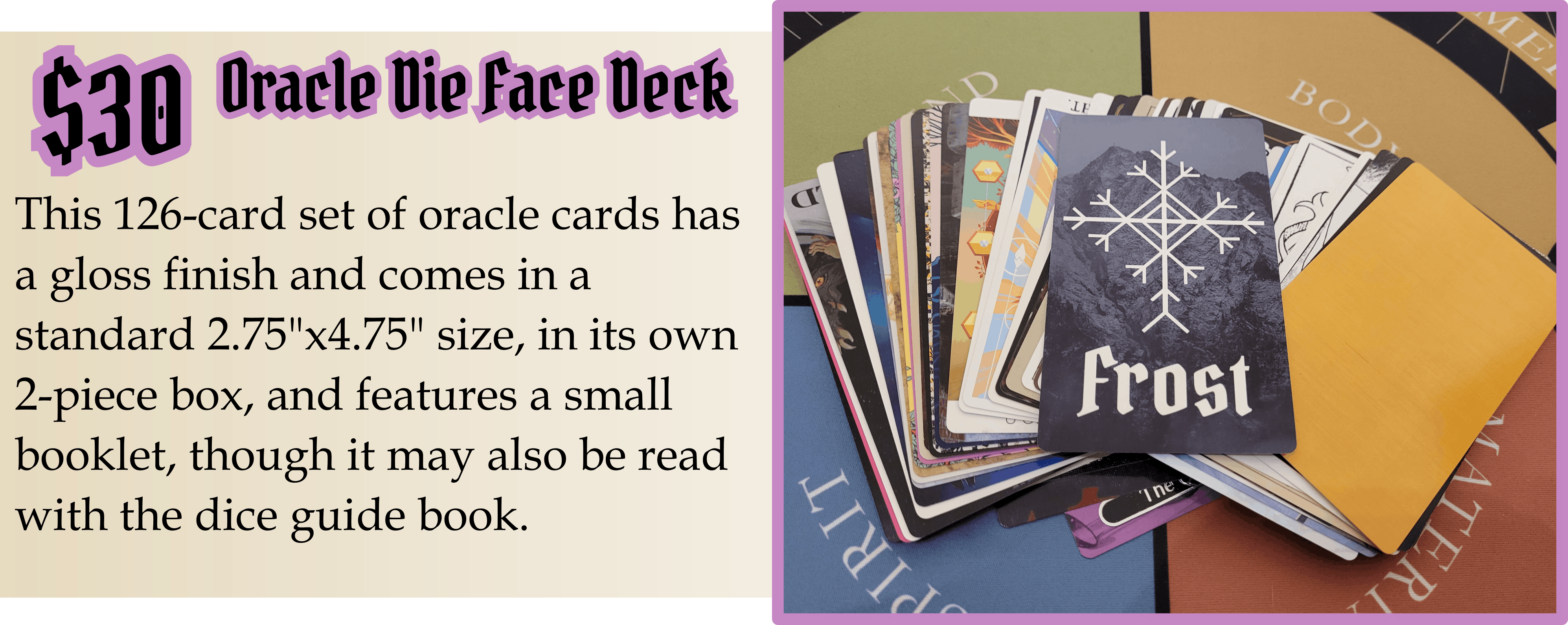 (This oracle deck will feature all 126 dice faces on the cards, with the same backs as the Lords Oracle and updated with the Lords Oracle card's front frames, but will otherwise be similar to the Frost card shown above!)