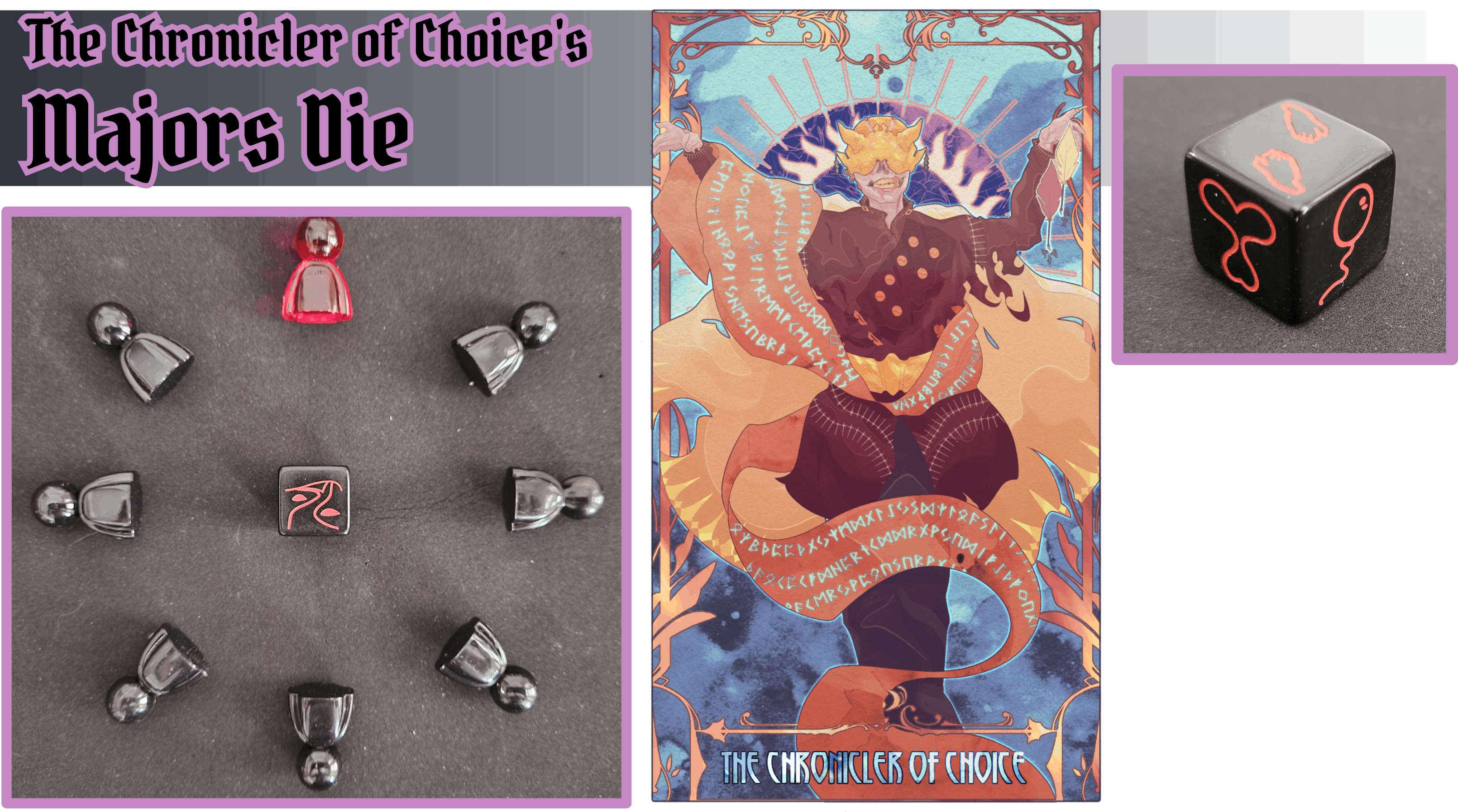 50,000 - Funded! 75,000 - The Nameless Mariner ... and a bonus $1000 goes to Sam Dow for designing the Mariner's Die! 100,000 - The Heir of Earth - And czarfunkle gets a bonus $2000 for their work on the Lords! 125,000 - The Quivering Monarch ... and a bonus $3,000 goes to Amy Smith for their work redesigning the dice symbols and designing the Monarch's Die! 150,000 - The Gambler - And a bonus $1000 goes to Caretaker for designing the Caretaker's Die! 175,000 - The Chronicler of Choice, The Accuser ... and the artists each get a bonus $100 to their pay! +10 Community Copies and +$100 to Community funds! 200,000 - The Collector of Selves, The Tarot Keeper ... and we unlock the Goblin's Coin, a Yes/No coin that is now available as a $3 add-on.