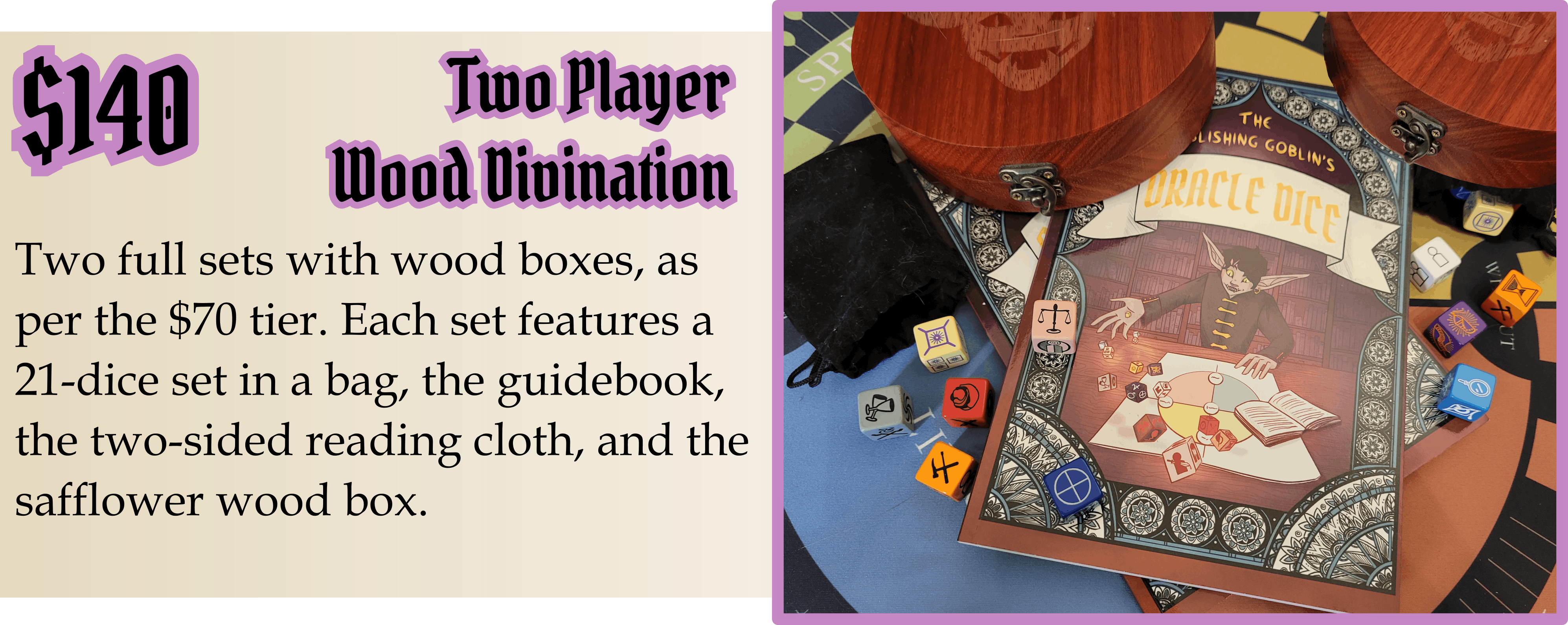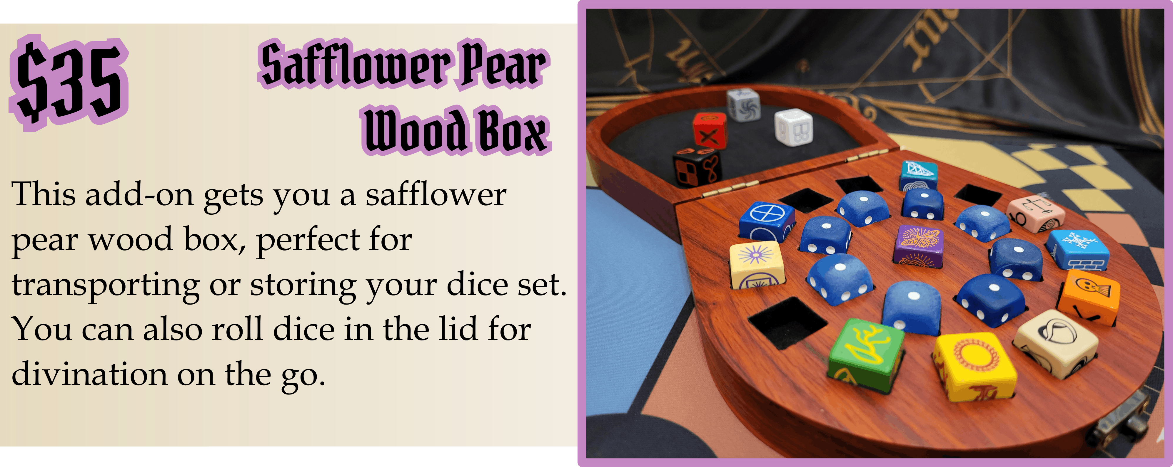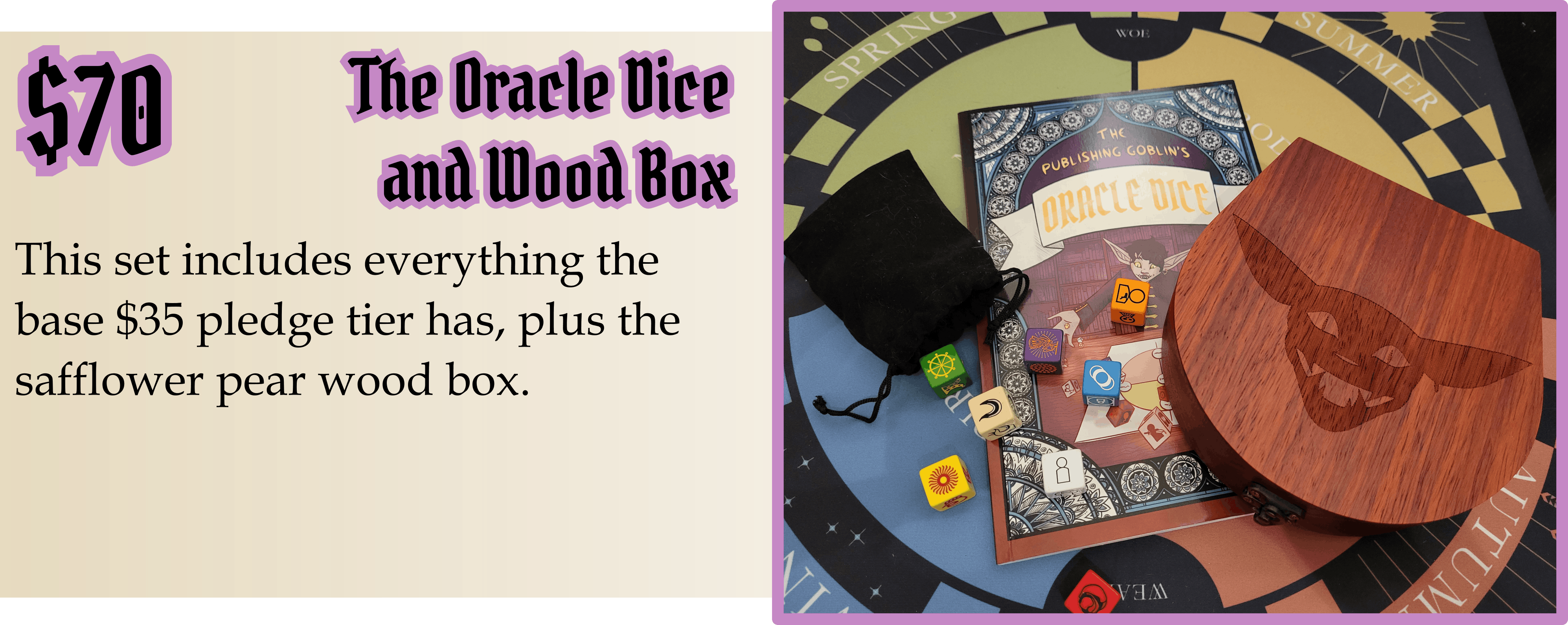 The Wood Box now features three options for the top etching. The Goblin Top, a in-design Dice Symbol Top, and a Blank Top. You will be able to choose which etching you want for each box you get in your pledge during the post-campaign pledge manager.
