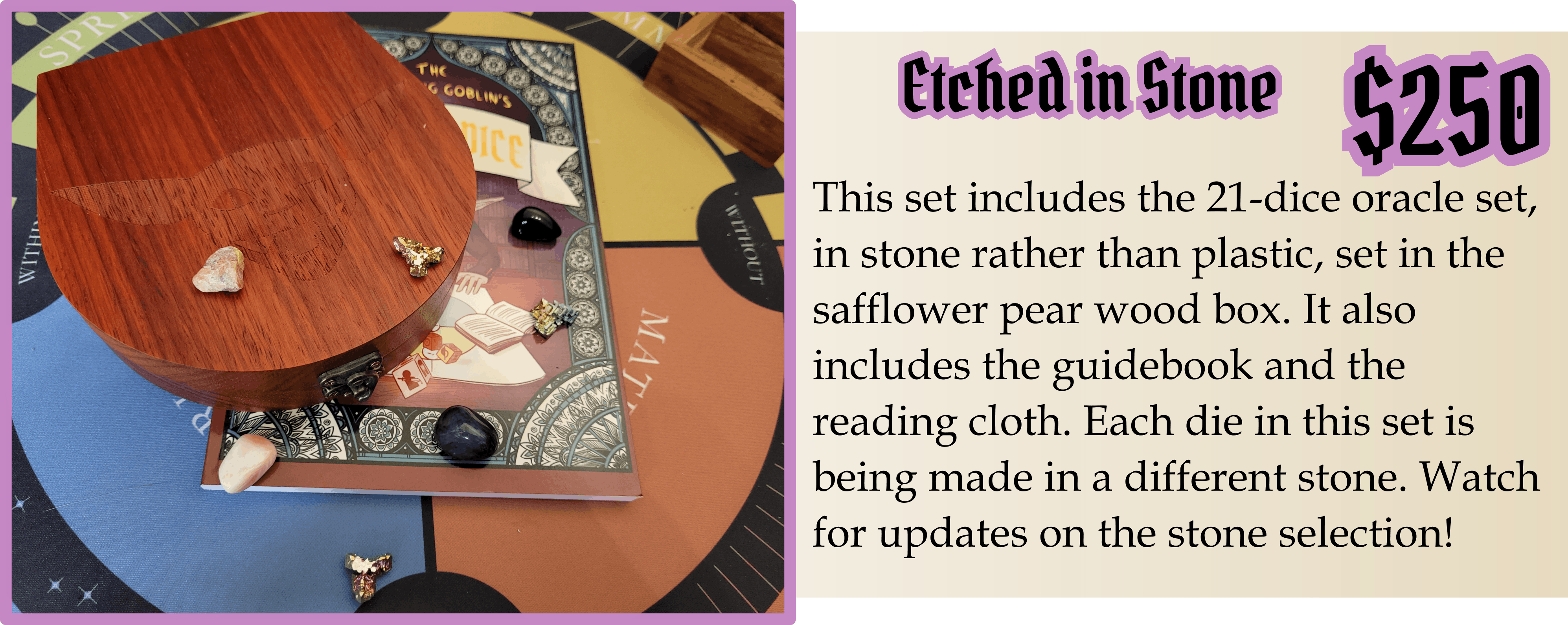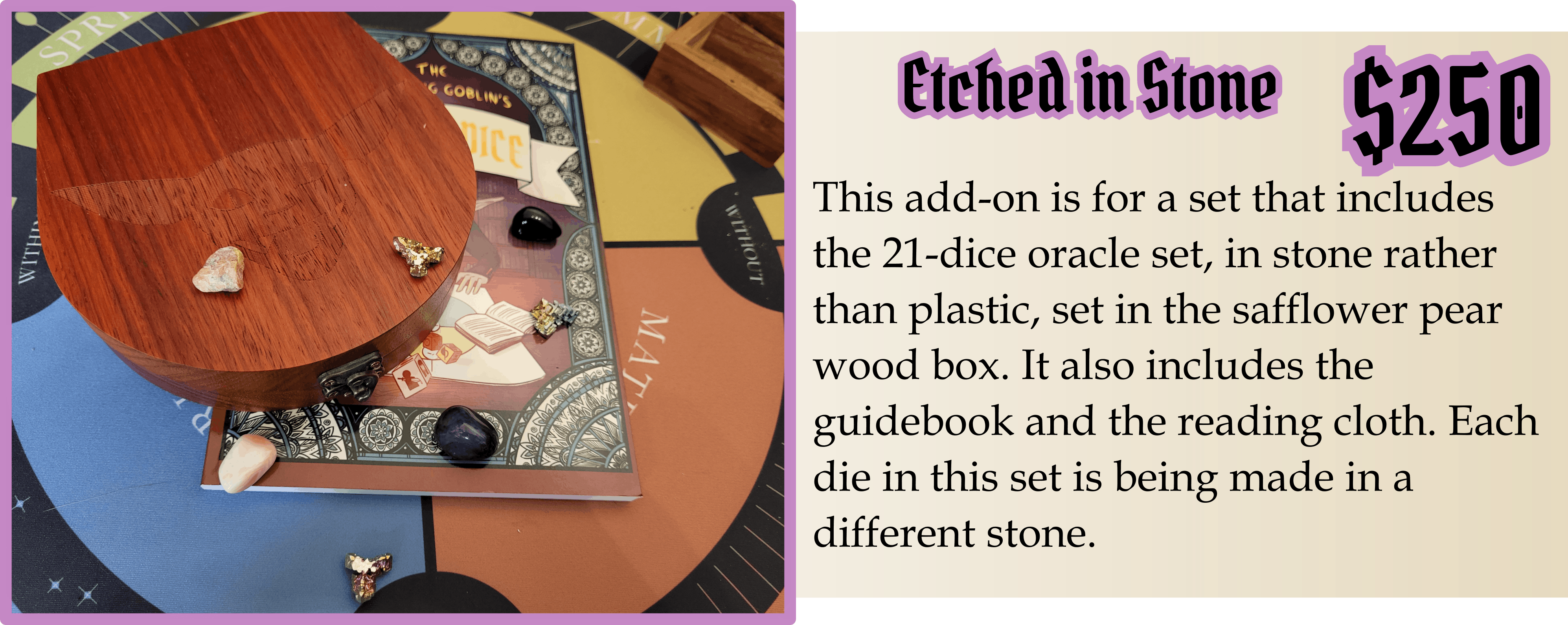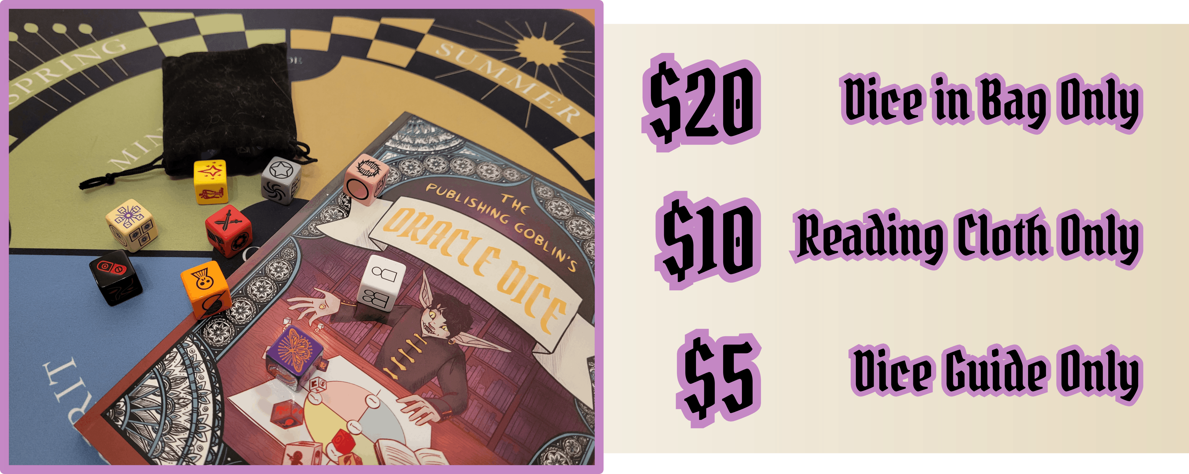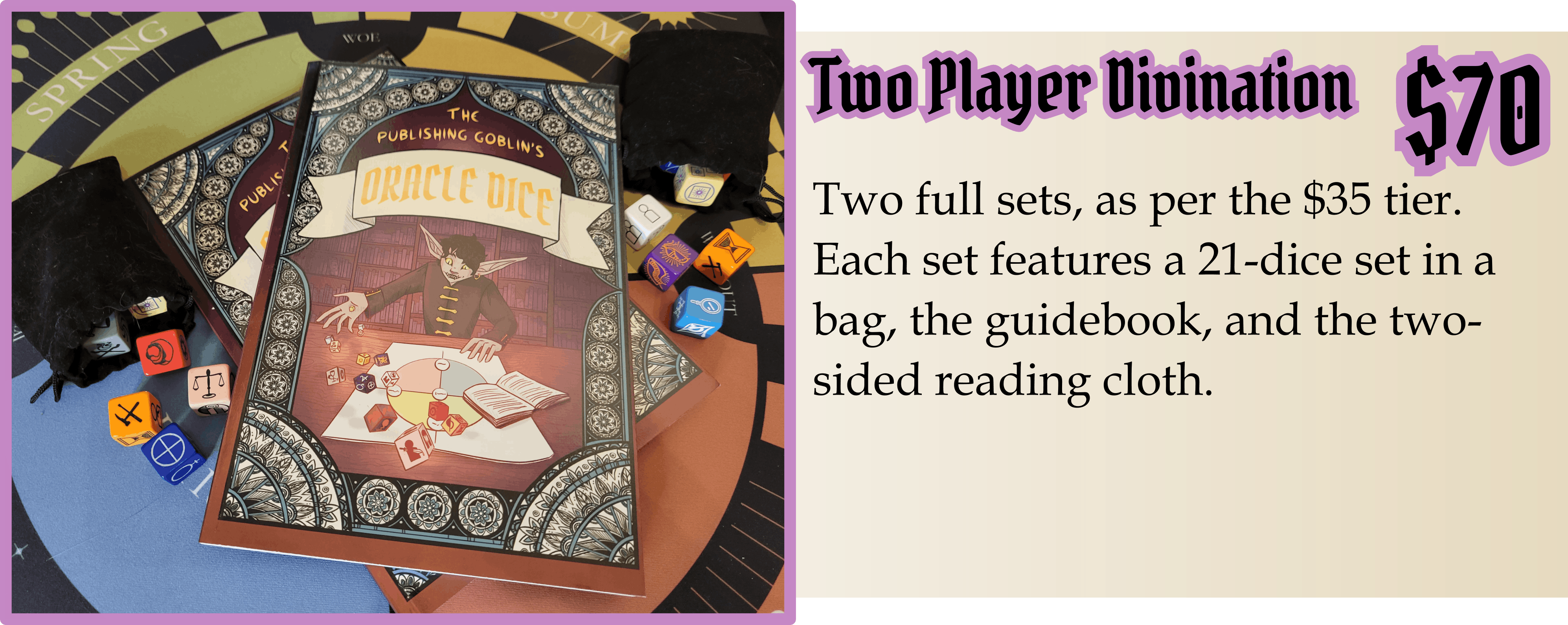The Publishing Goblin’s Oracle Dice are a set of 21 custom-made dice, each a unique color with six symbols of their own, paired with an in-depth full color guidebook which will help you read your dice. Cast over your bare table, or over the grids of the reading cloths prepared just for this dice set.