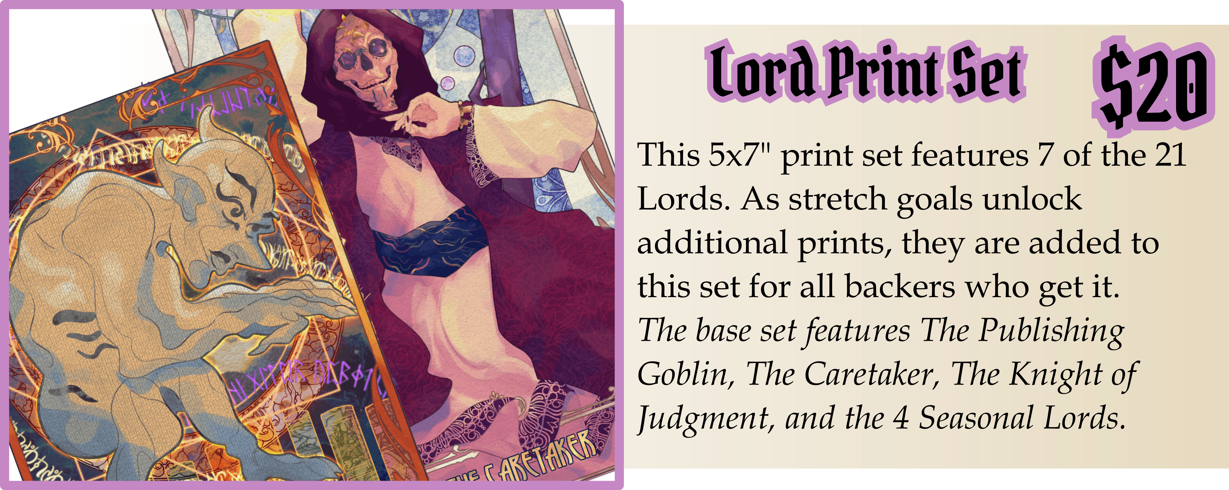 At each stretch goal, we add one of the 14 Lords of the Dice to the print set, listed in italics at the front of the goal, as well as other goodies! Let's take a look at what all there is to unlock!