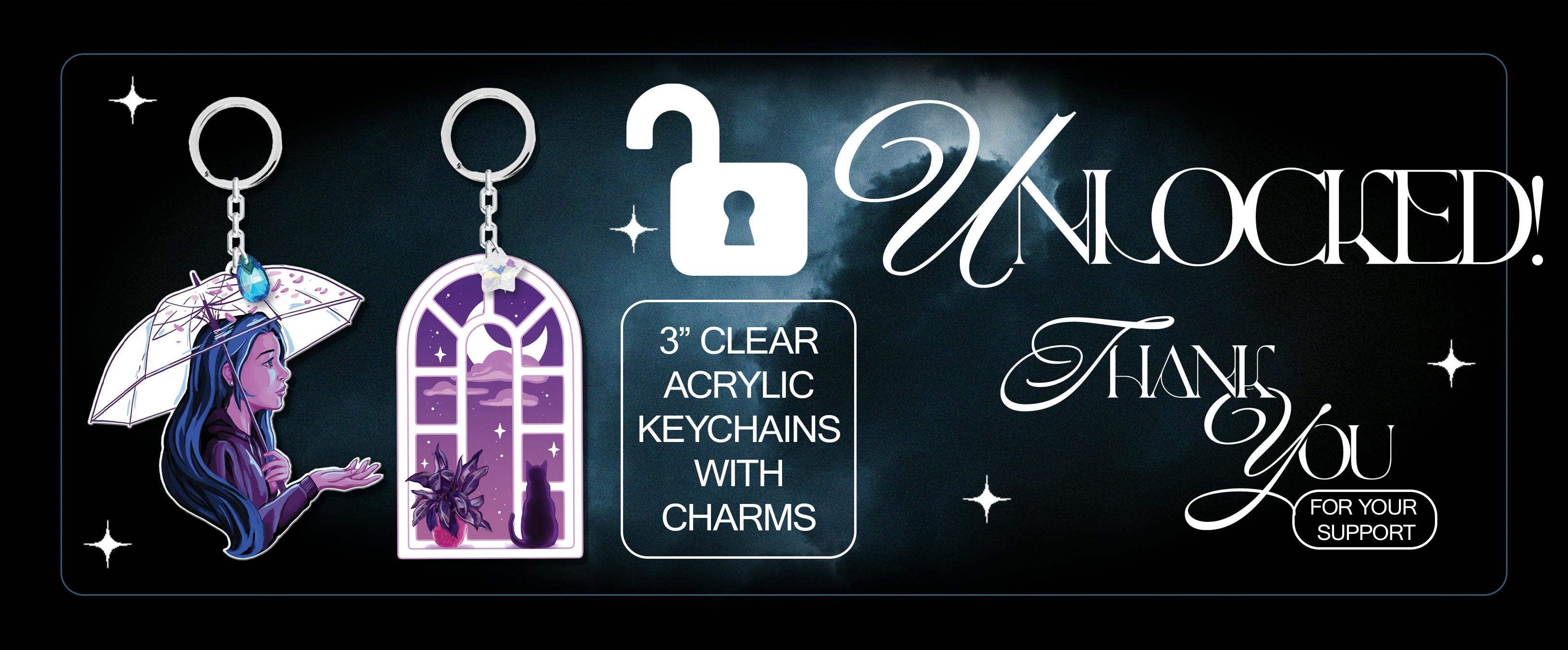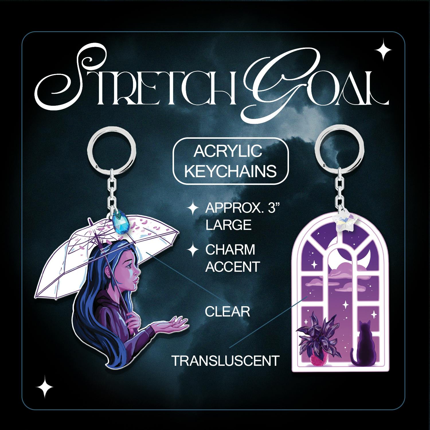 The next stretch goal are these Acrylic Keychain designs! Each design will be approx. 3" at their largest size and will have a small charm attached. Each design also has clear and translucent design features! All of these are now available in the Add-Ons!