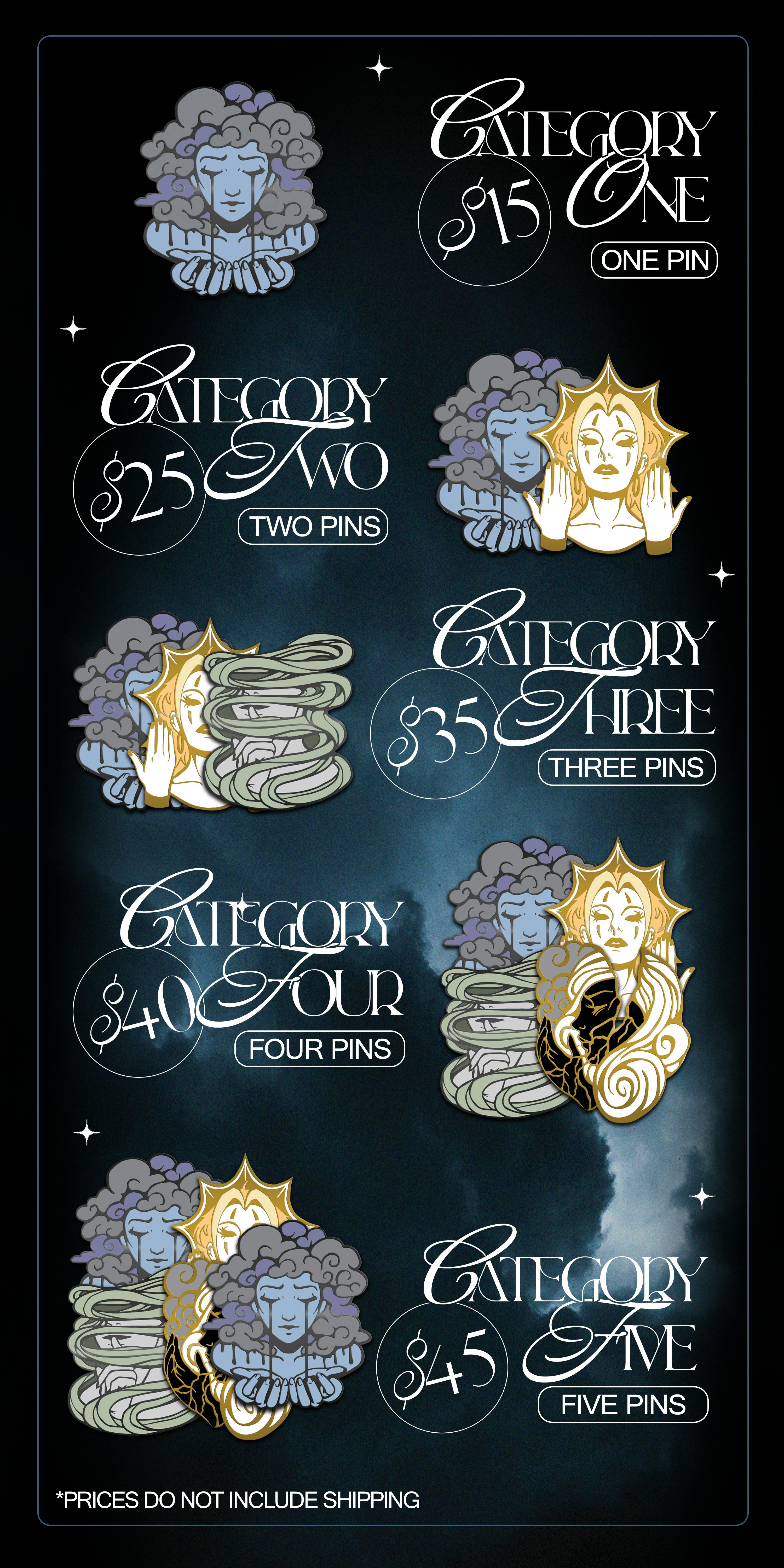 This campaign features 4 pin designs (Rain, Sun, Fog, Storm), as well as a collaboration pin and the potential for additional designs to unlock with additional funding.