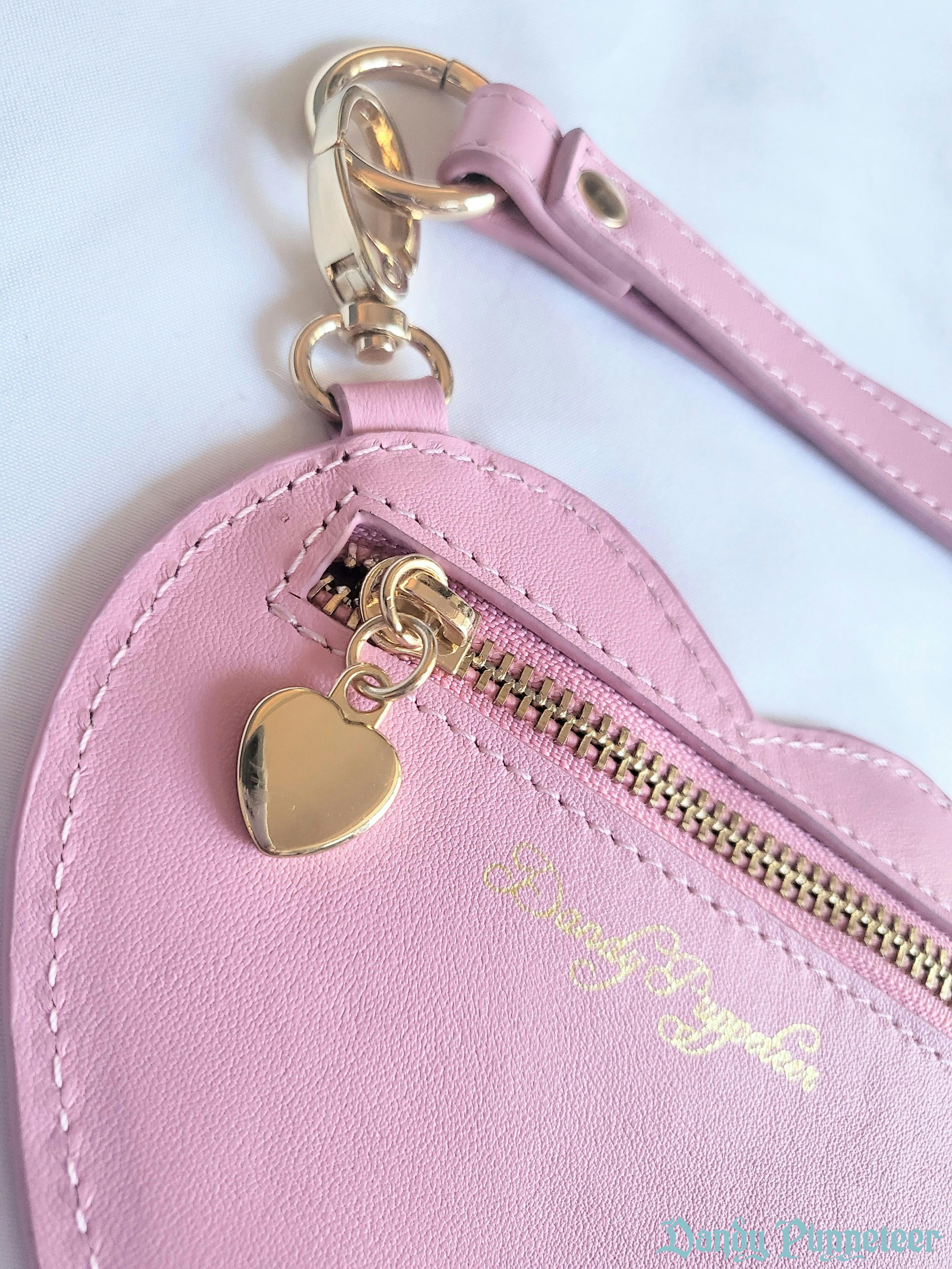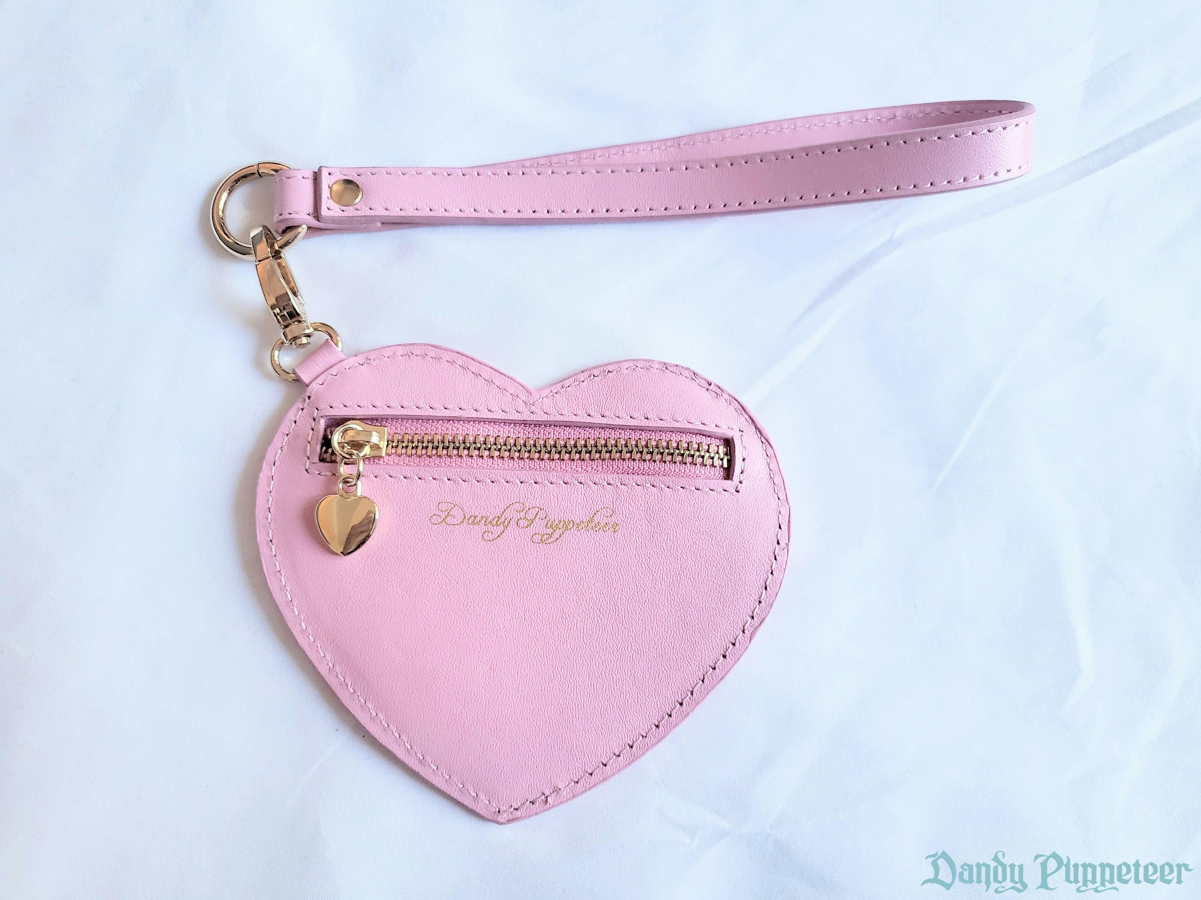 A cute strap wallet with a 5.25inch x 4.75inch heart that is perfect for holding your coins, bills, or cute photos. It also has an 8inch strap. It can be worn around the wrist or hooked onto another purse with its lobster clasp. It features a cute heart shaped zipper pull and gold foil details. Â