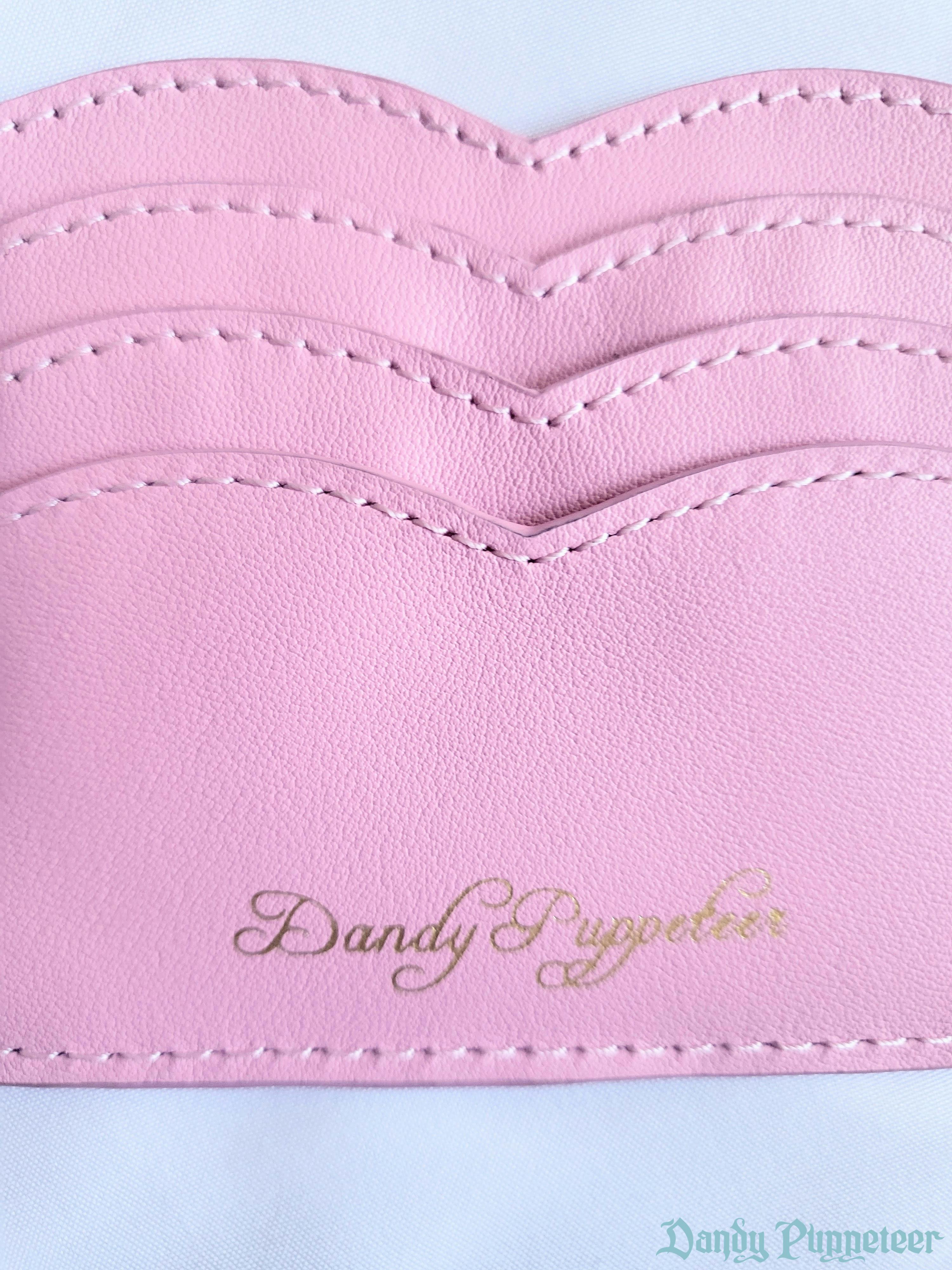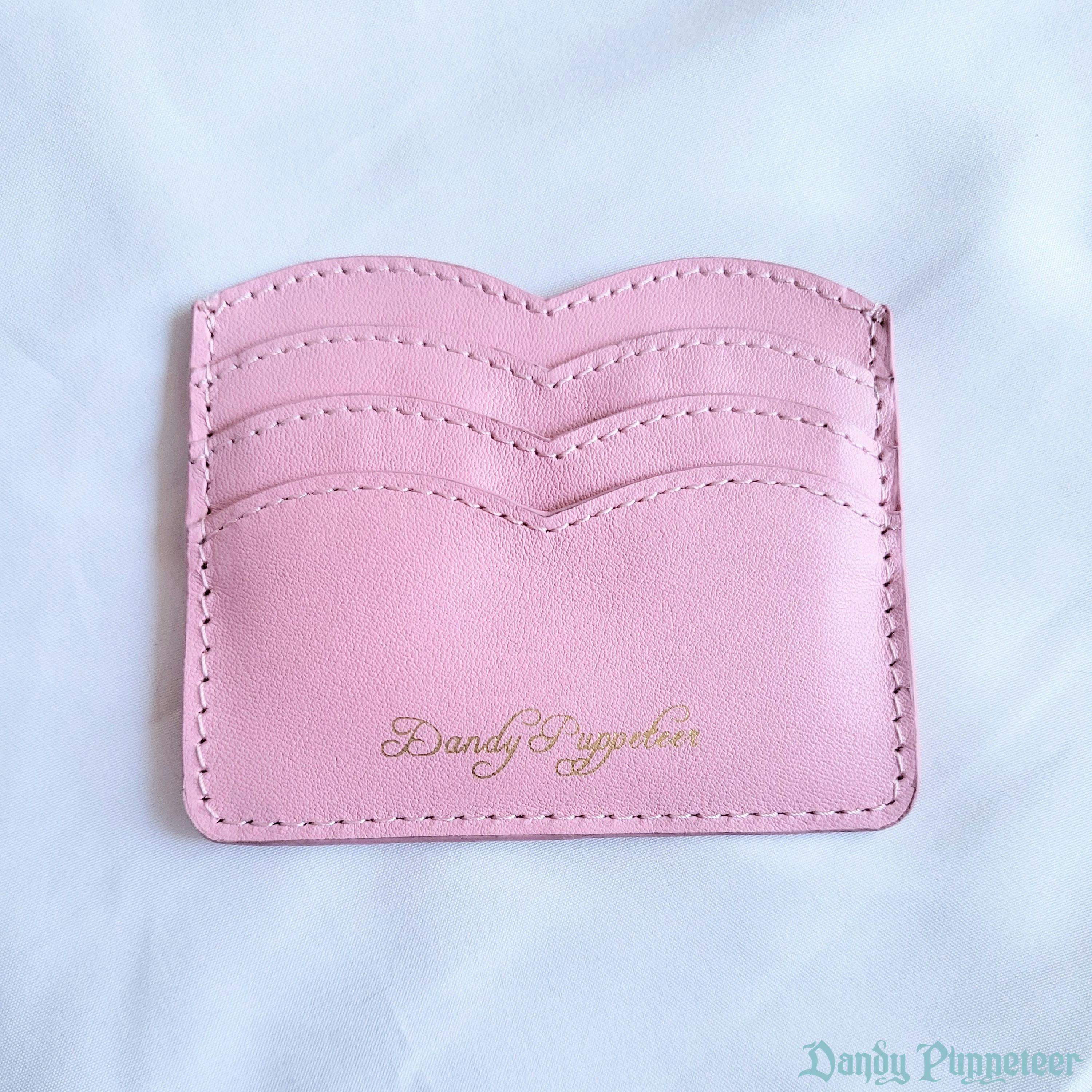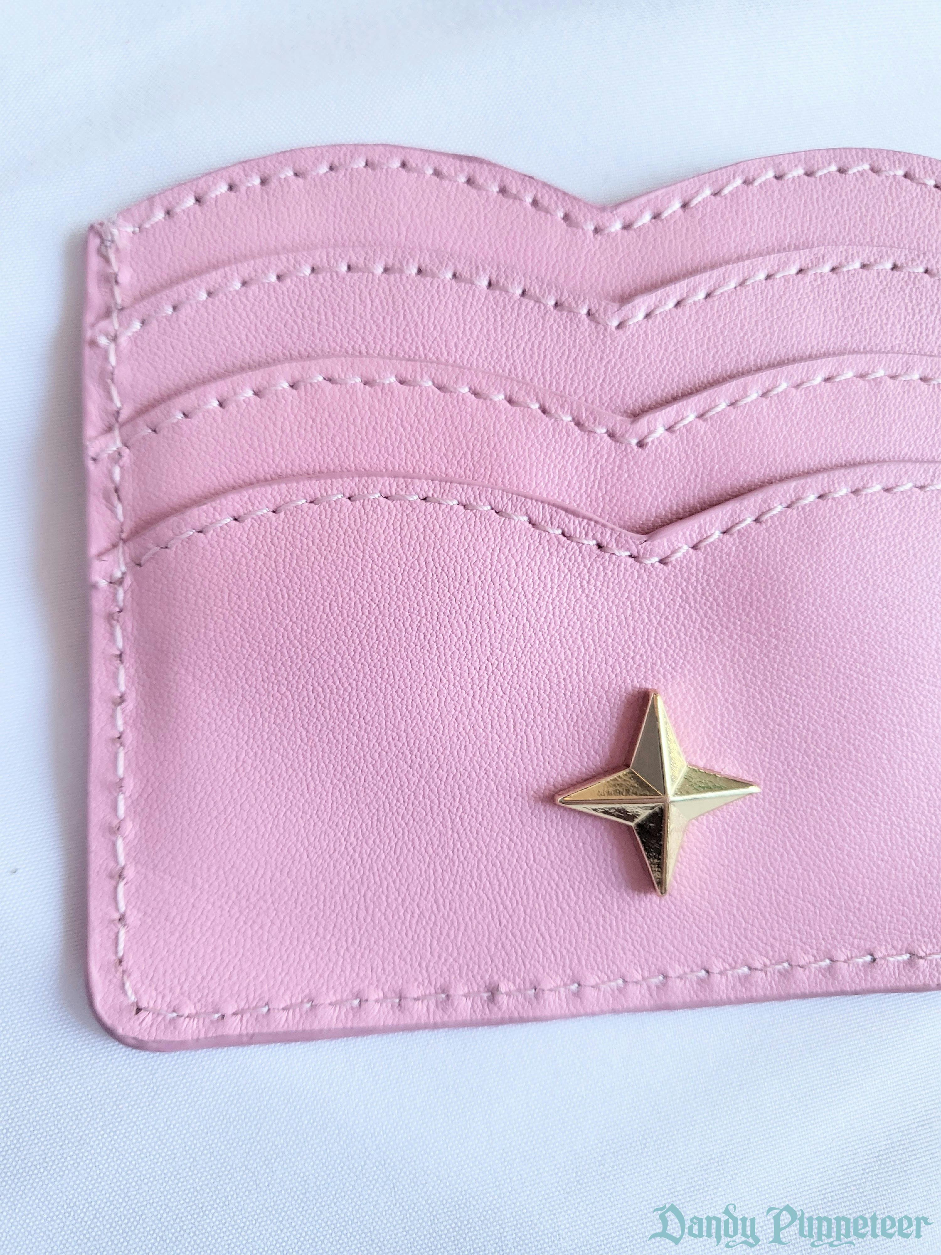 A cute wallet with a scalloped design made to resemble a heart. It is in by 4.75inch by 3.5inch and can fit comfortably into a pocket. It has a custom 4-pointed metal star on one side and our logo gold foil on the opposite side. It can hold 7 cards, photos, and currency bills. Â