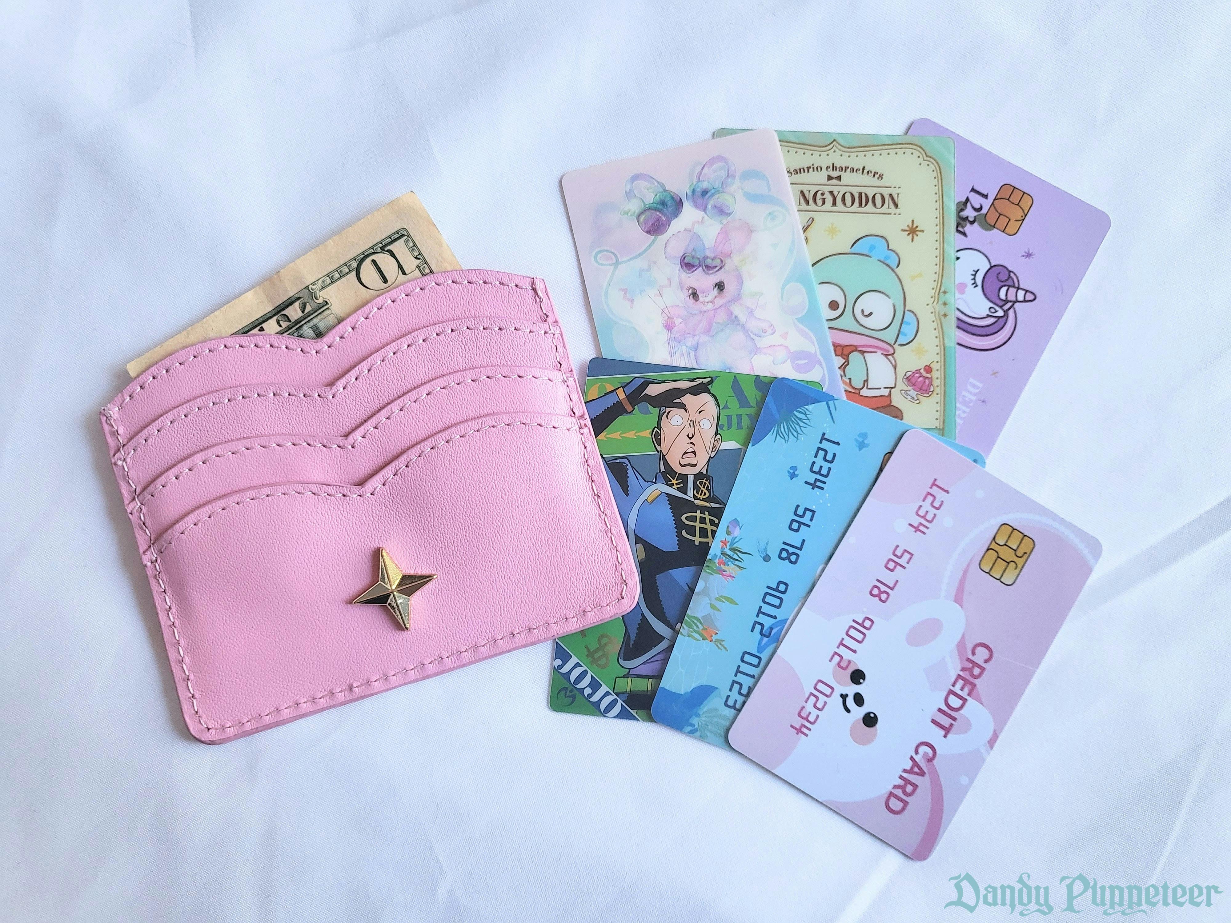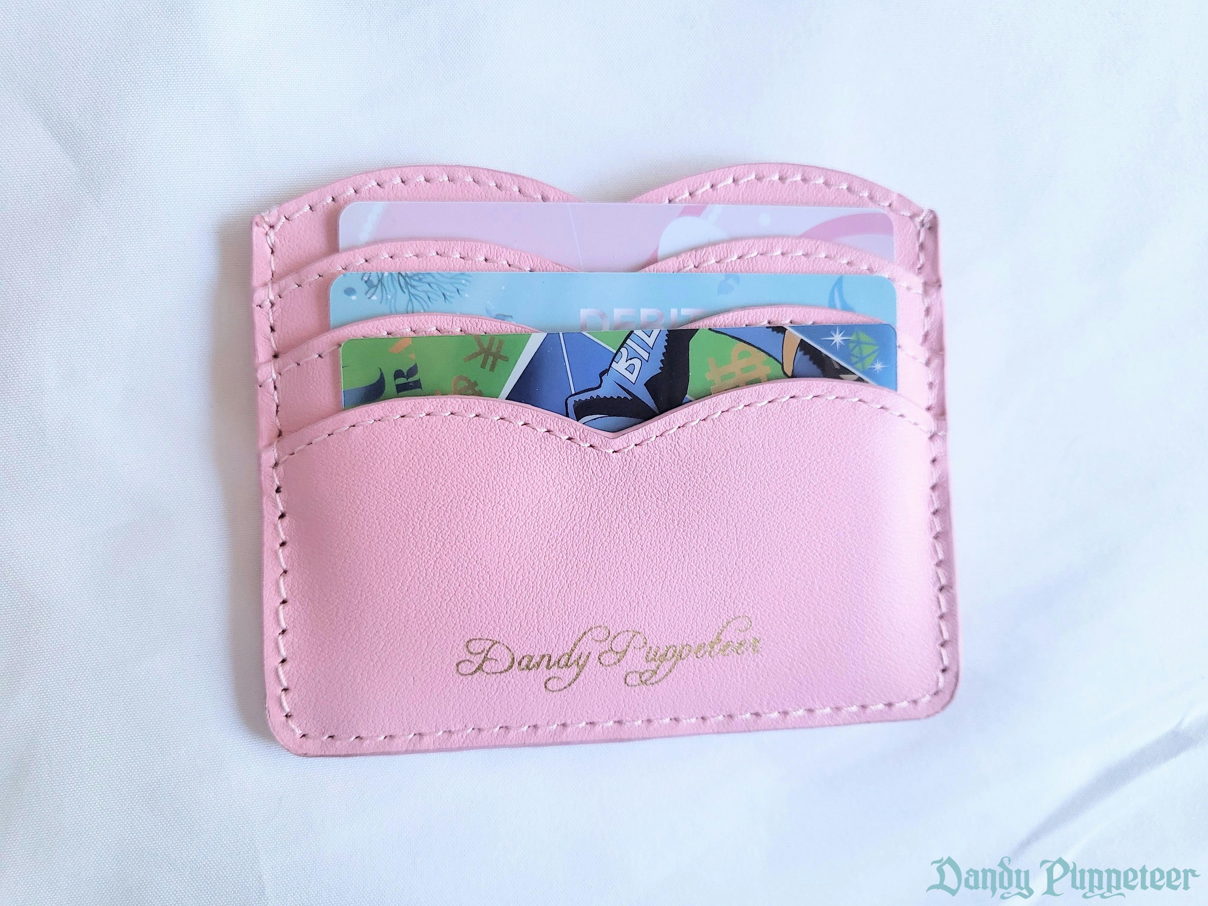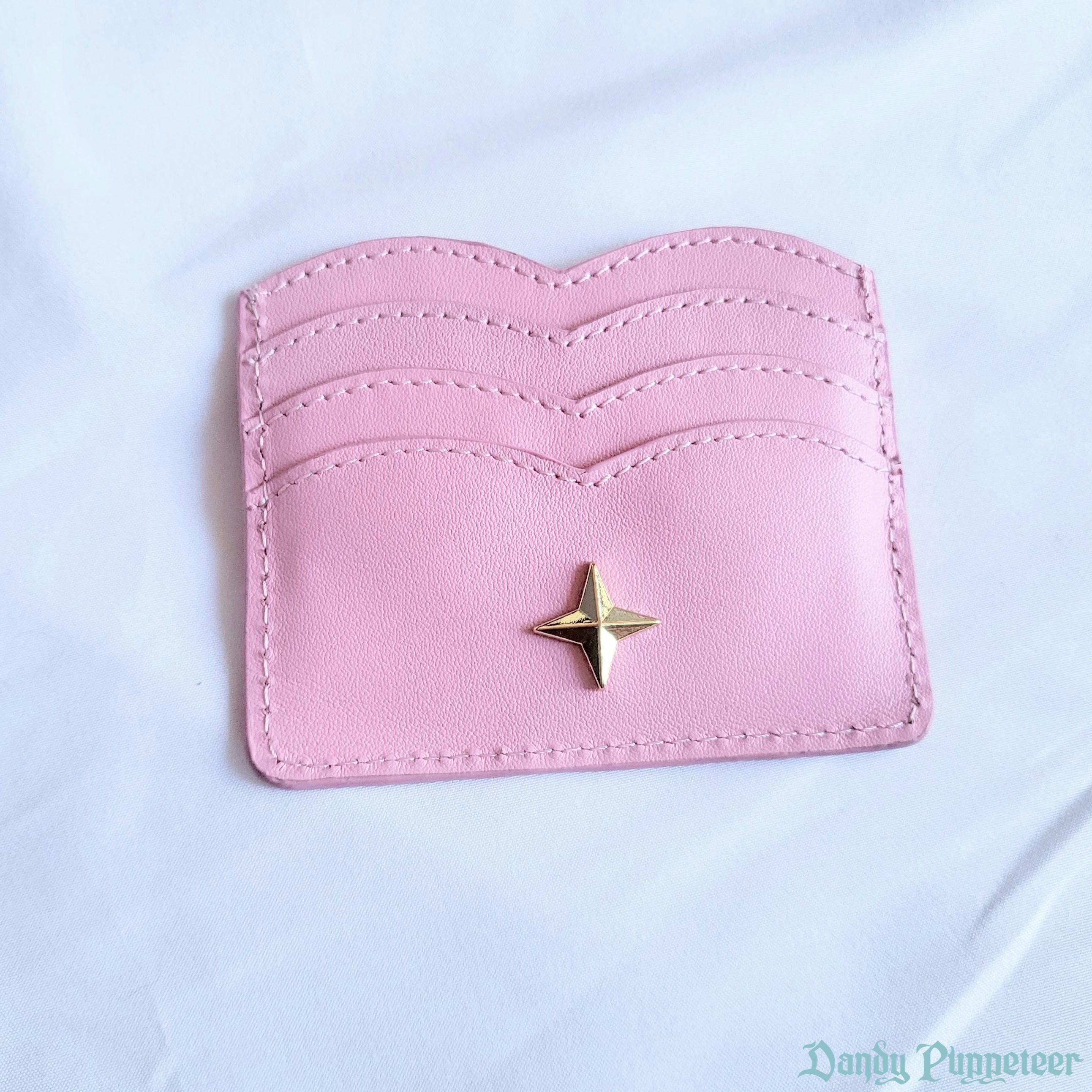 A cute wallet with a scalloped design made to resemble a heart. It is in by 4.75inch by 3.5inch and can fit comfortably into a pocket. It has a custom 4-pointed metal star on one side and our logo gold foil on the opposite side. It can hold 7 cards, photos, and currency bills. Â