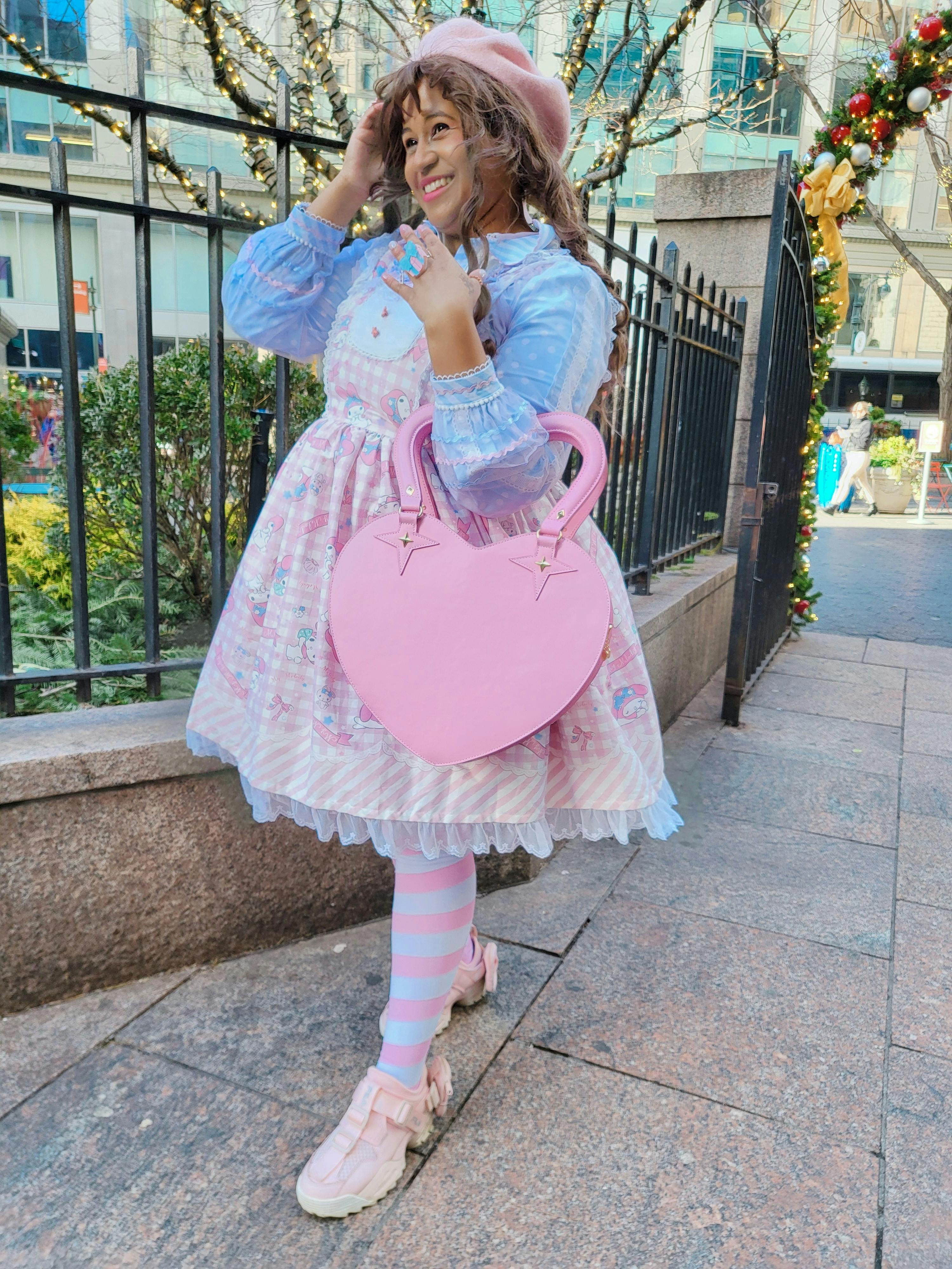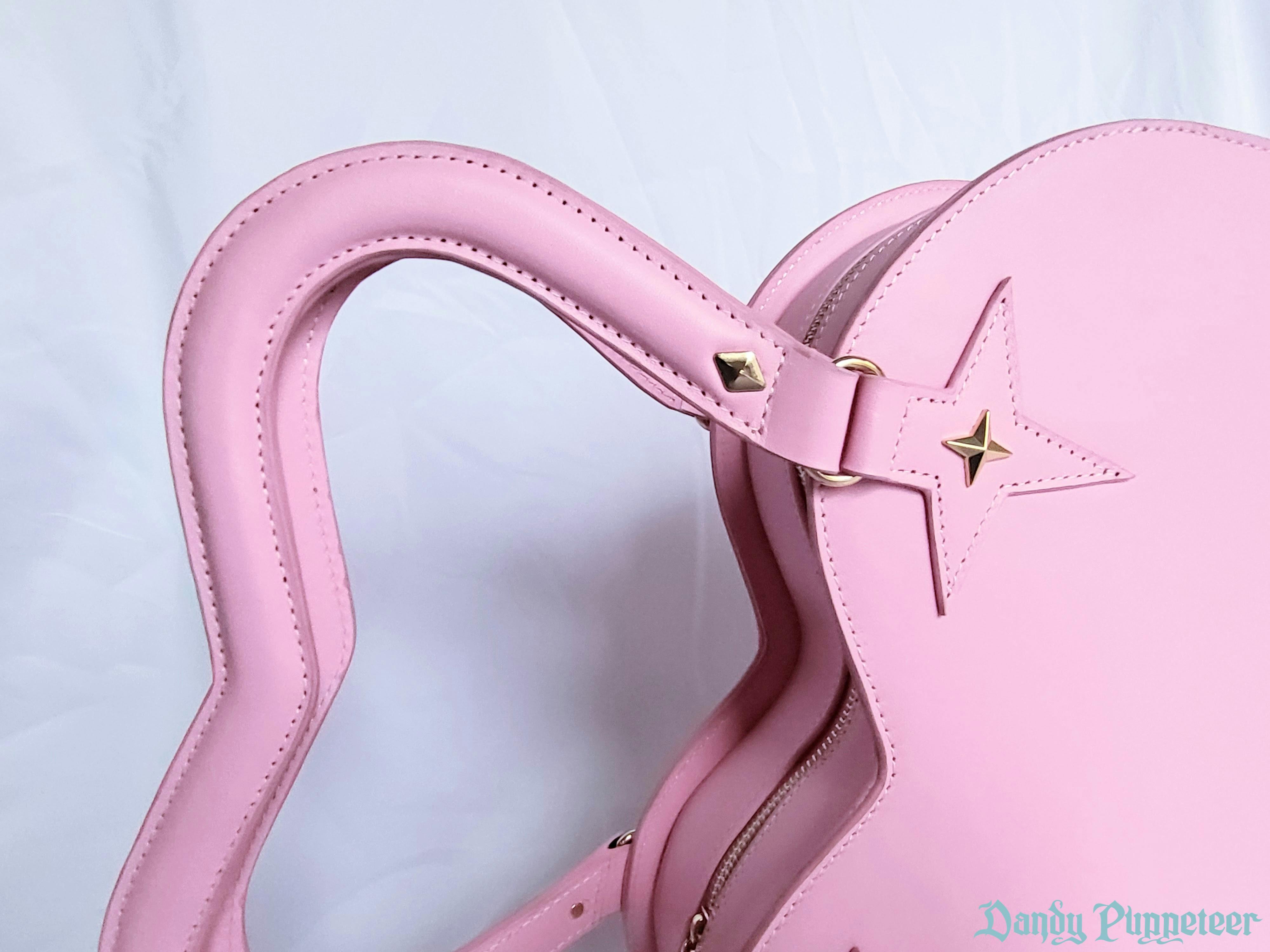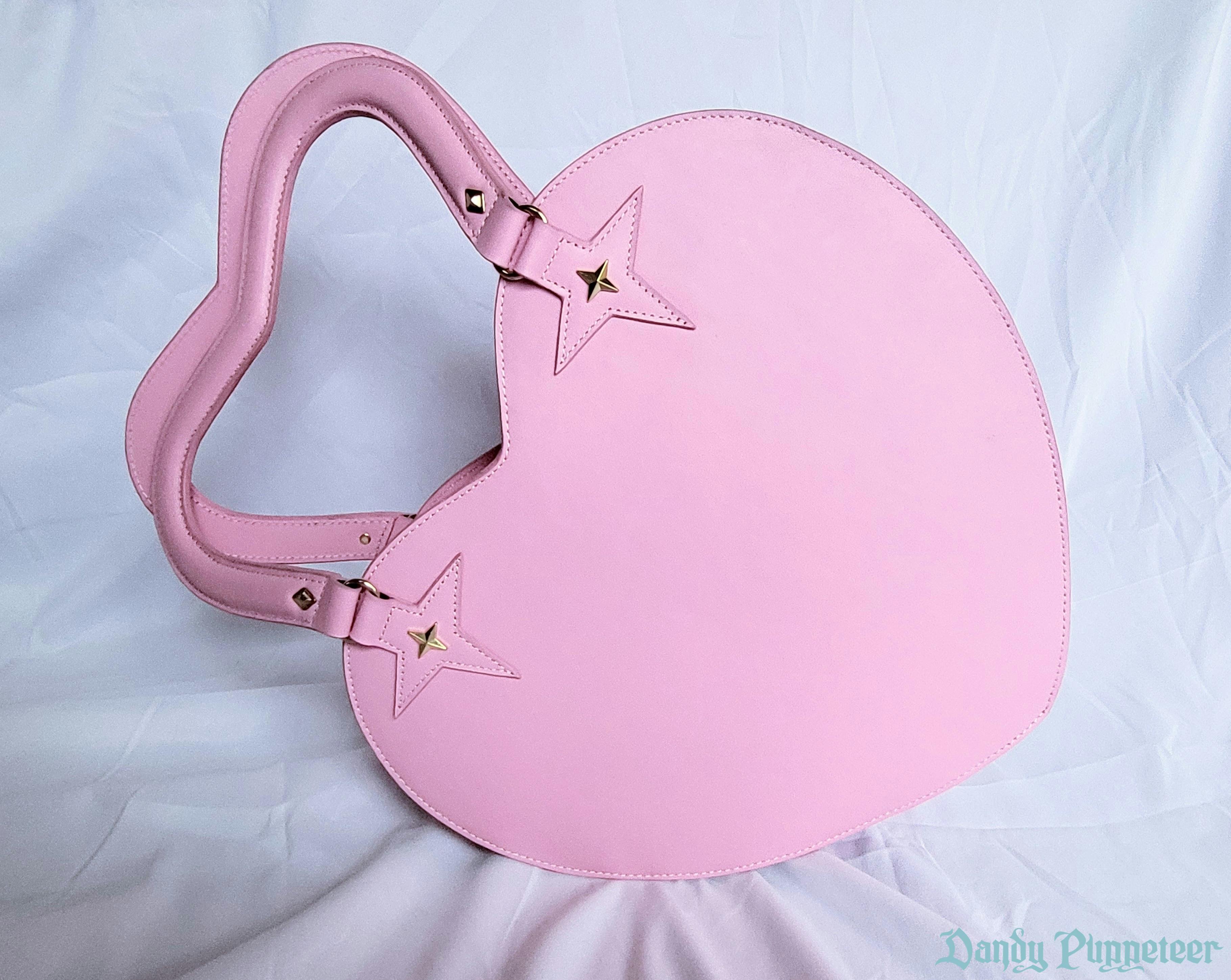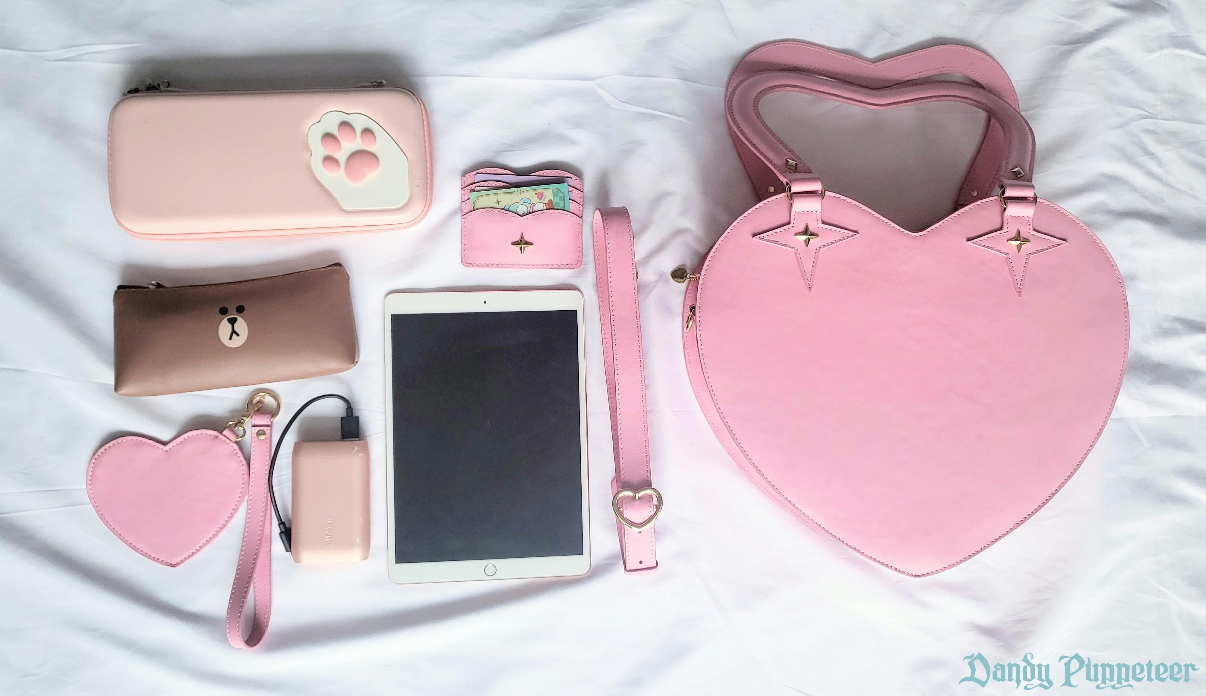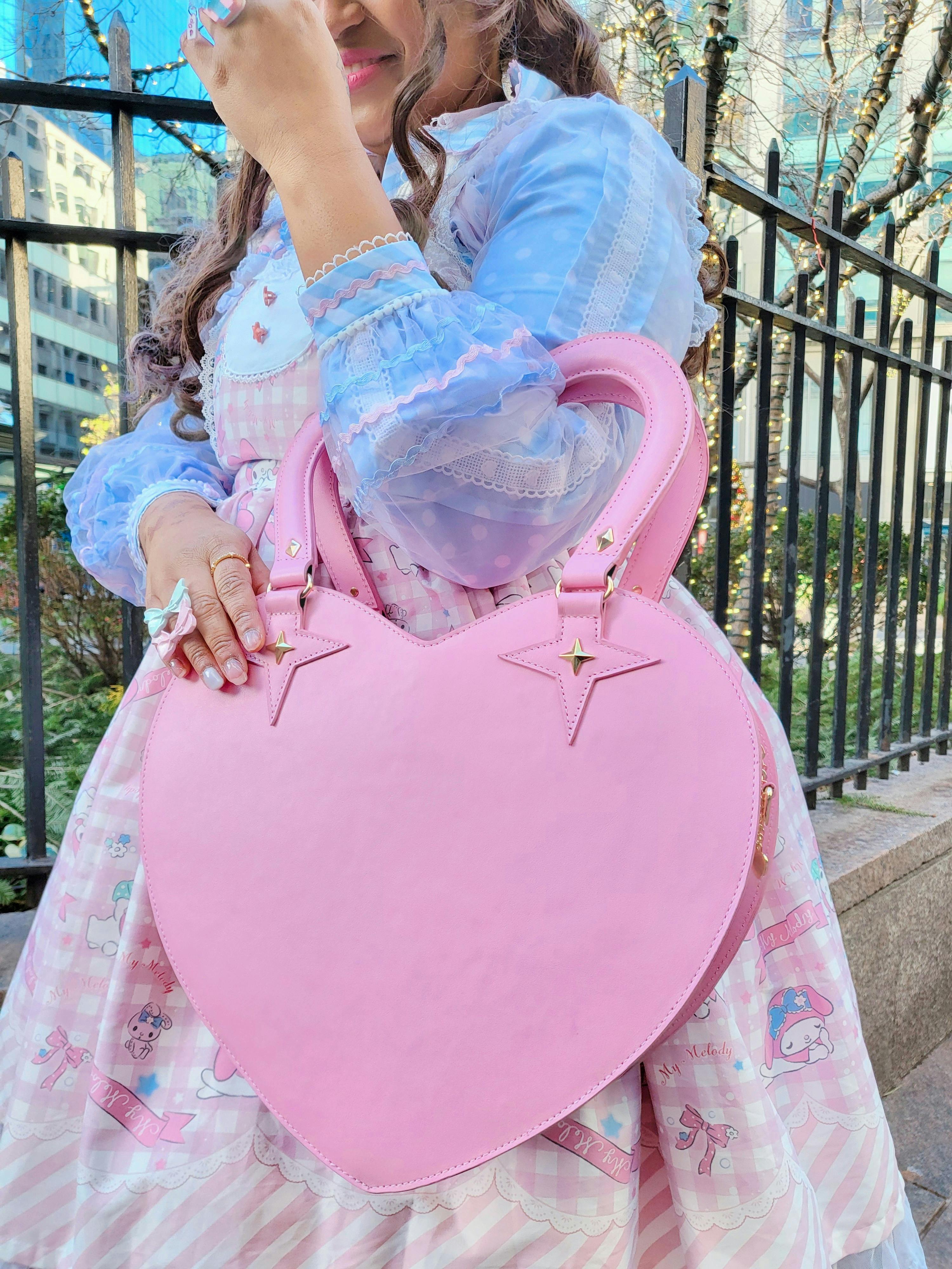 The bag is 14inch by 13inch in size with a 6.5inch handle and a 4inch depth. It has an outside pocket and 2 internal pockets. It can carry a pencil case, wallets, a Nintendo Switch, an iPad, and much more. The bag features a cute heart shaped handle that's rounded for comfort while holding. The bag also includes shoulder straps so it can be held handheld or worn across the shoulder cross-body style. Â