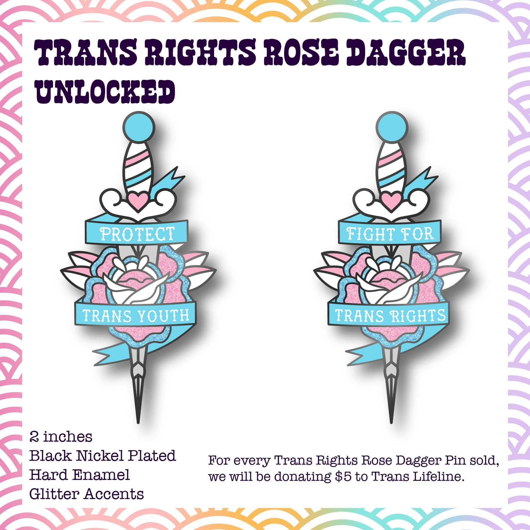 In the last year the Do No Harm Dagger has been one of the most popular selling designs at The Snarky Company. I've taken this popular design and turned it into a design to raise money for Trans Lifeline. For each Trans Rights Rose Dagger Pins sold, we will be donating $5 to Trans Lifeline. For additional information on Trans Lifeline and the services they provide, please visit: https://translifeline.org/