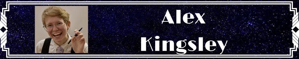 Alex Kingsley (they/them) is a writer, comedian, and game designer. They are a cofounder of Strong Branch Productions, where they write and direct the Audioverse-Finalist sci-fi comedy podcast The Stench of Adventure. They’ve been a voice actor for various other podcasts, including Whisperling and Spirit Box Radio. Works include Empress of the Sands, Creatures of Ruin RPG, The Strange Garden and Other Weird Tales, Unplanned Obsolescence.