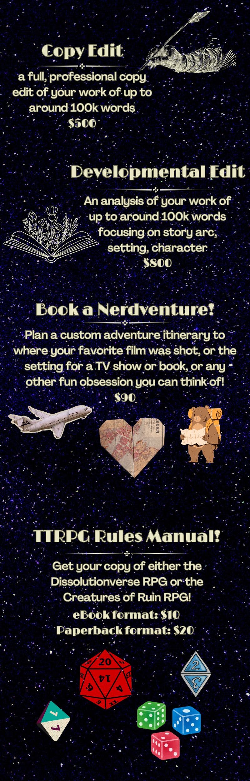 COMING END OF 2024: The Dissolutionverse TTRPG - The Dissolutionverse is an intergalactic society of ten homeworlds connected by music-based magic instead of spaceflight. People step from world to world, but only through portals created by one of the maji, those few who can hear the Symphony underlying the universe. When a majus changes the notes of the Symphony, reality changes with it.