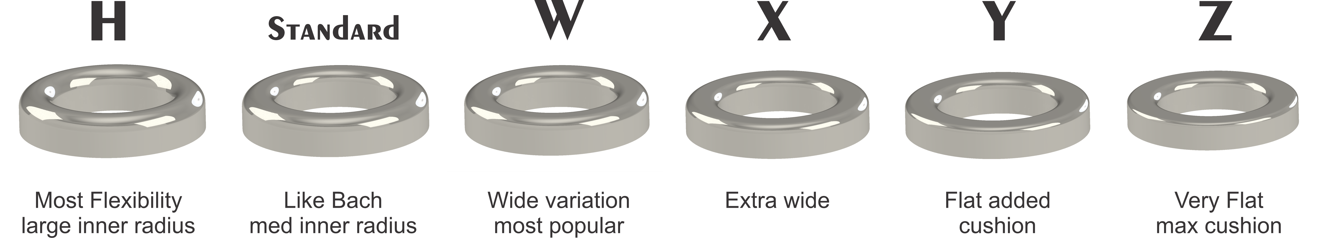 Semi-flat - slightly flat version of "Wide" Flat - just like it sounds, more surface area on your lips Very Flat - maximum surface area for less mouthpiece pressure