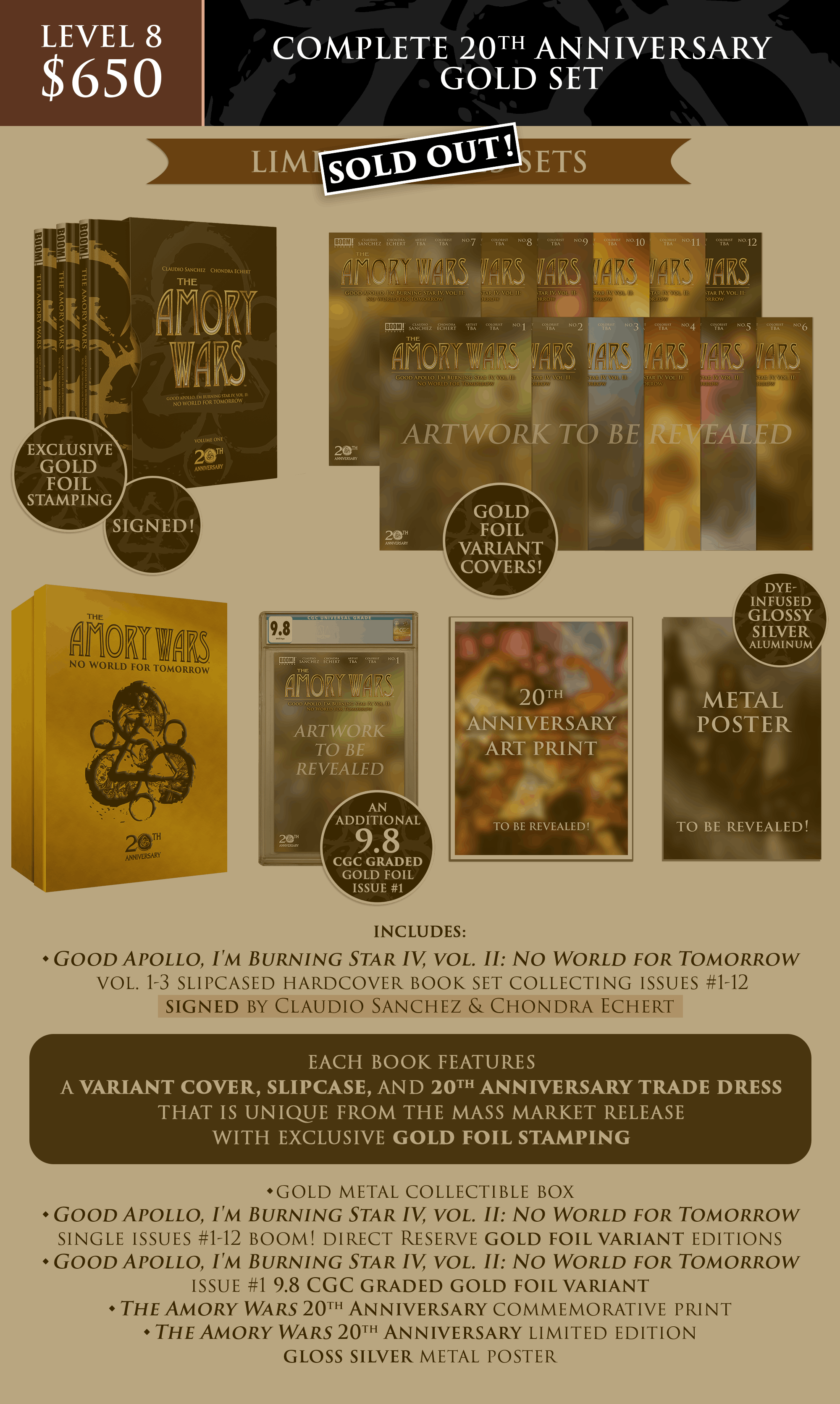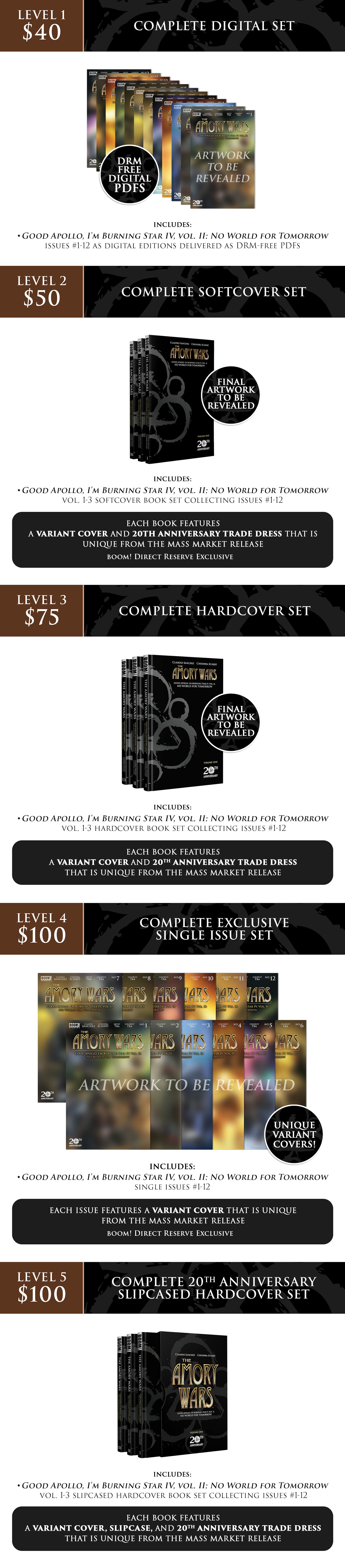 Available exclusively through this BOOM! Direct Reserve campaign, fans of THE AMORY WARS and COHEED and CAMBRIA can reserve THE AMORY WARS: GOOD APOLLO, I’M BURNING STAR IV, VOL. II: NO WORLD FOR TOMORROW as a complete premium set of 12 BOOM! Direct Reserve exclusive variant cover single issue comic books or 3 BOOM! Direct Reserve 20th Anniversary collected editions. Both the comic books and collected editions are available in a variety of increasingly limited variant formats.