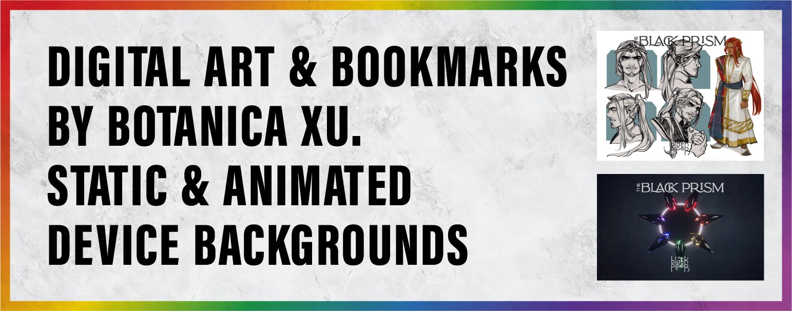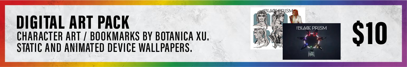 Botanica Xu: all character bookmarks. "Kip the Lip," "Kip Turtle-Bear," "Gavin the Prism," "Dazen the Prisoner," "Karris the Blackguard," "Karris White Oak," "Gunner the Madman," "Gunner the Mastermind" Maggie Ivy: 7-pointed Star design & Quintar in-world coin design Ian Riley: The Black Prism Album Cover Art, Reflections Album Cover Art, Refractions Album Cover Art Carly Kjelstrom: Campaign Design andReward Mockups