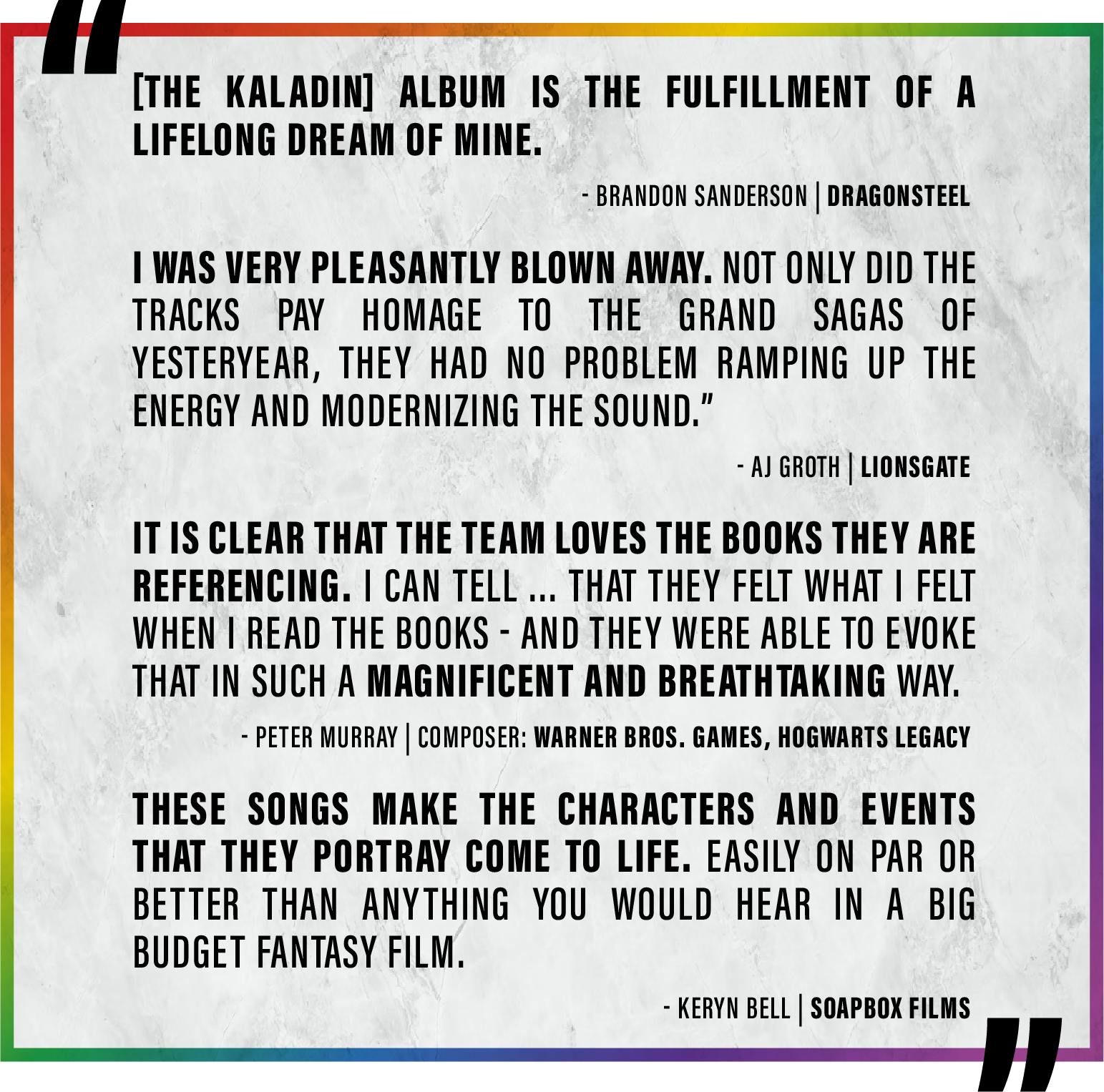 These songsβ stories are quite personal and touching, and some are extremely painful, but our Kaladin backers have agreed to let us share these tracks with you - and in some cases to share their stories.
