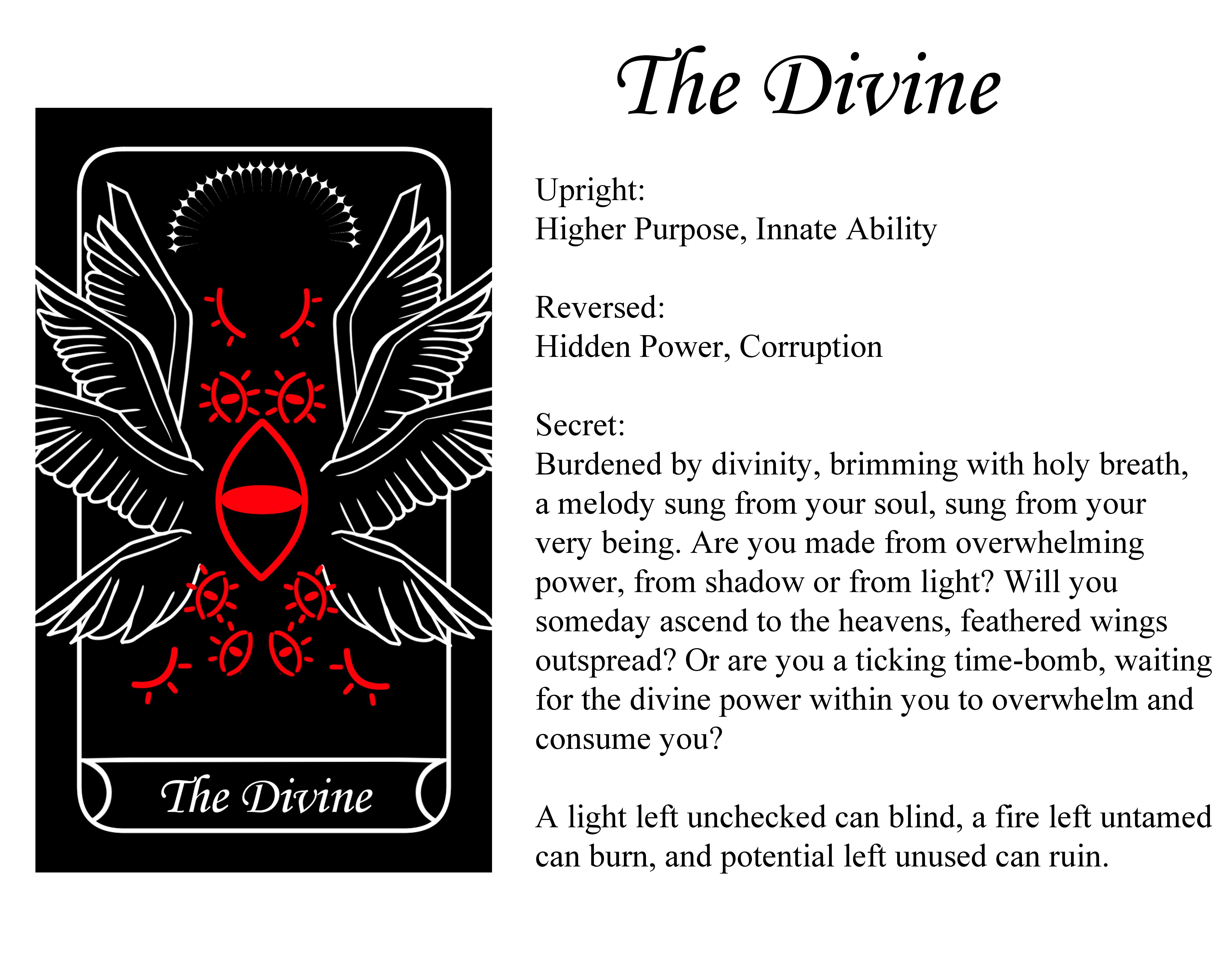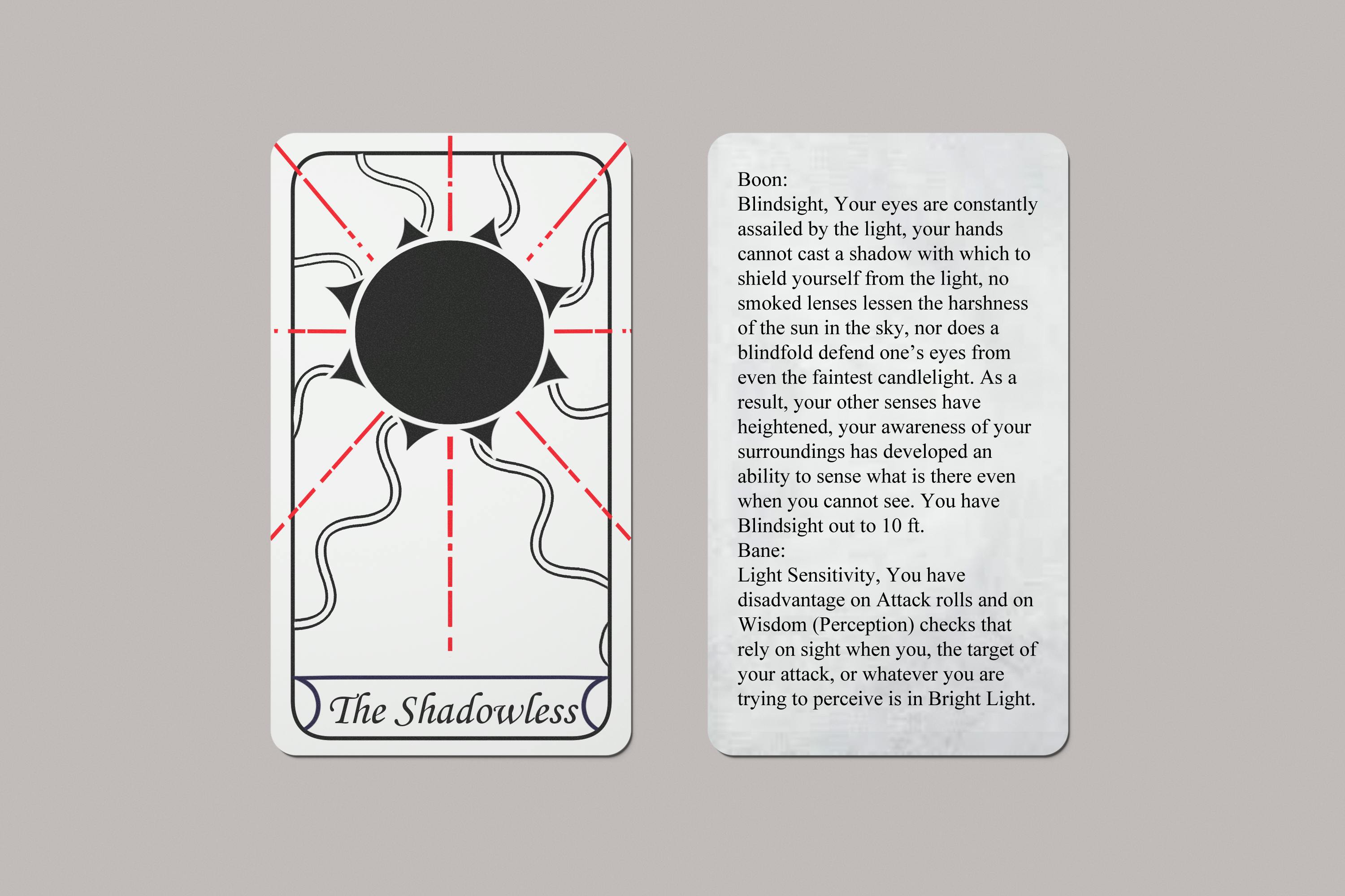 I must admit, I do just enjoy making card deck designs, I even previously borrowed The Deck of Many Things to use as a basis to make a tarot style card deck. The idea came that I should assign cards to these secrets so players could actually pull from the deck rather than roll a d20 and the secret is assigned a number. This then became the eternal question I have with projects of ''What more can I do with this?'' and ''How far can I take this?'' I wanted to take the character creation idea further, I wanted to allow this deck to have a variety of uses as a story telling tool. By drawing inspiration from oracle, homebrew, my own love of making the saddest and most flavourful characters possible; the deck became what it is.