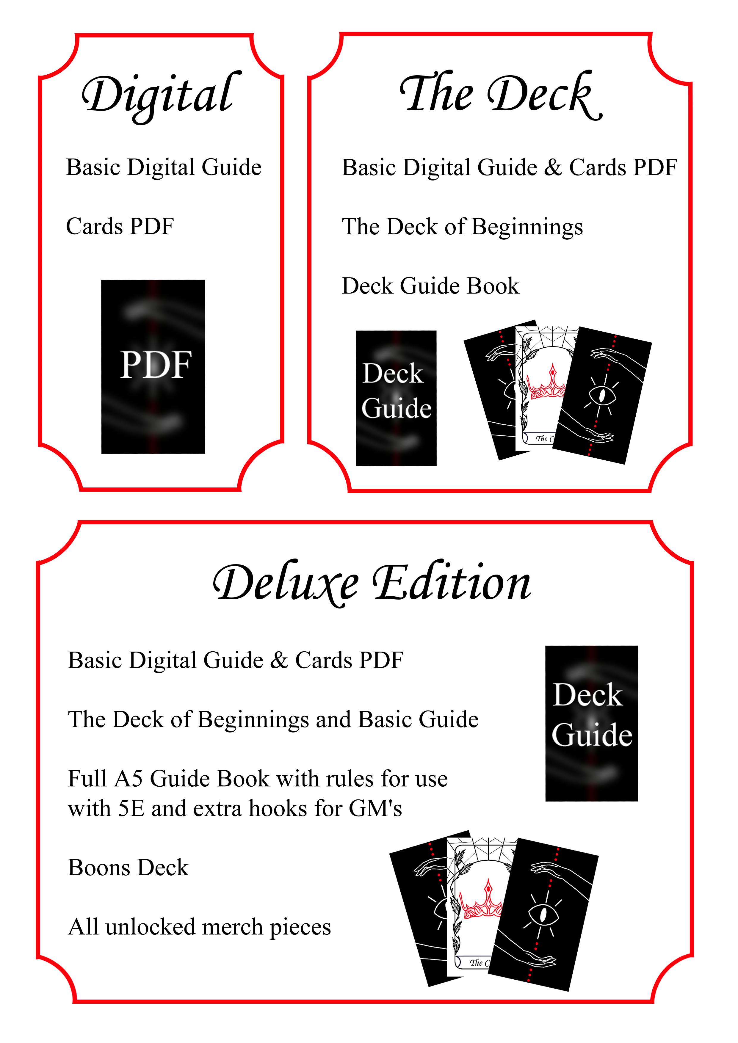 Get the Deck and guide, plus full guide book including stats for use in 5E games and plot hooks and story ideas for DM's. As well as the boons companion deck and all unlocked merch pieces.