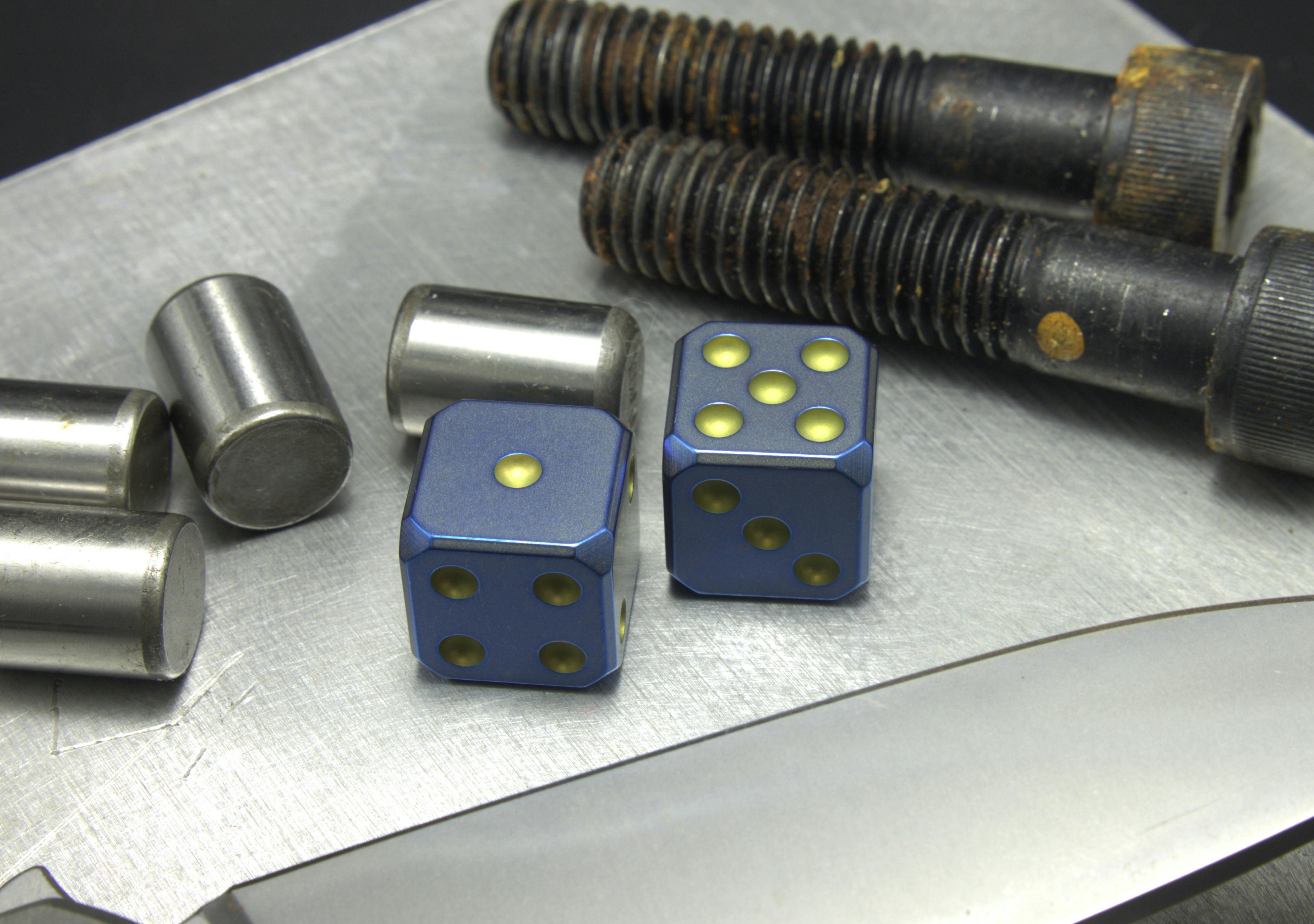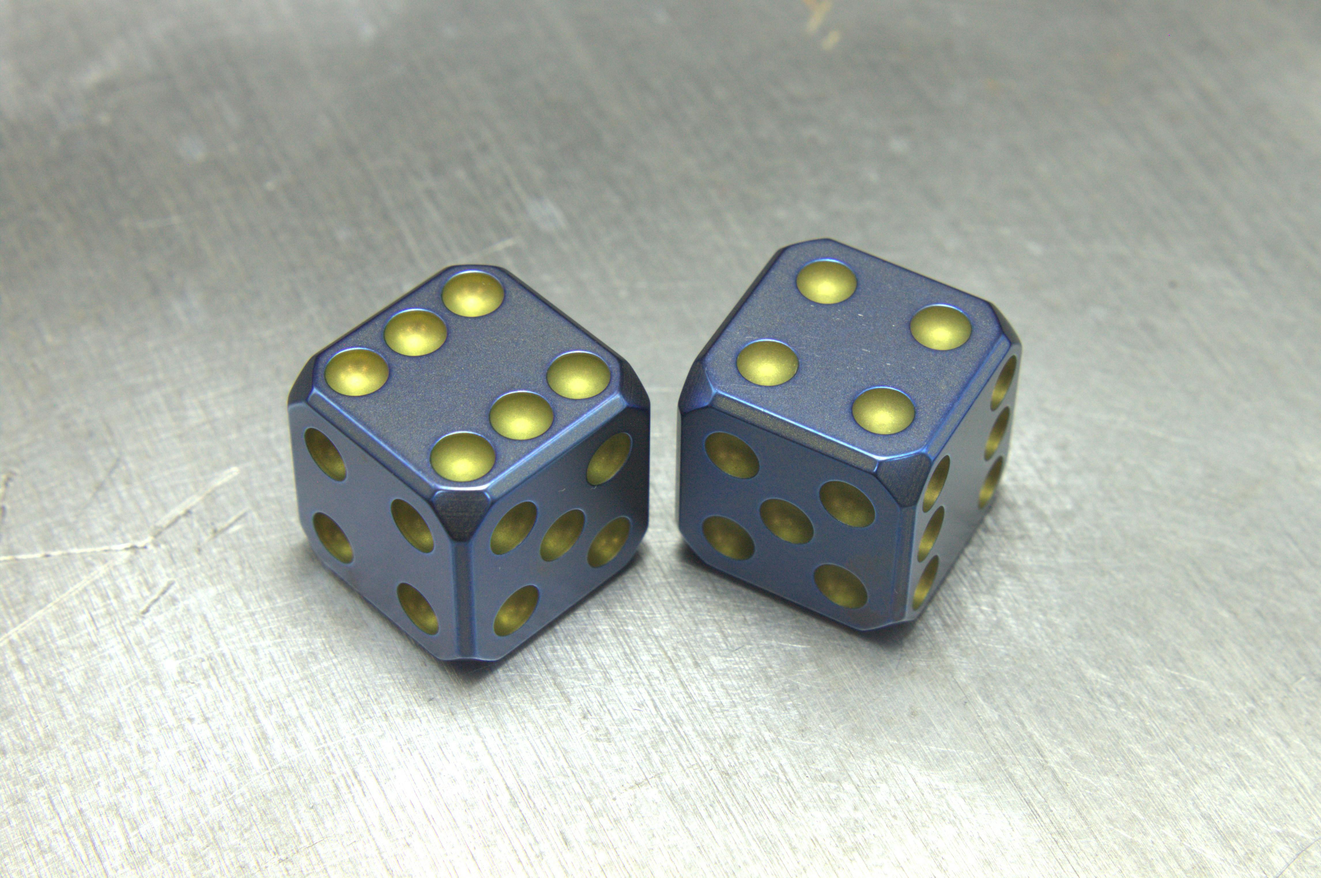These dice are CNC machined from grade 5 titanium, then blasted, hand sanded, anodized, and stone washed in various orders to achieve a multi-tone aged variegated finish in the colors of Fallout. There are two finishes offered in this project.
