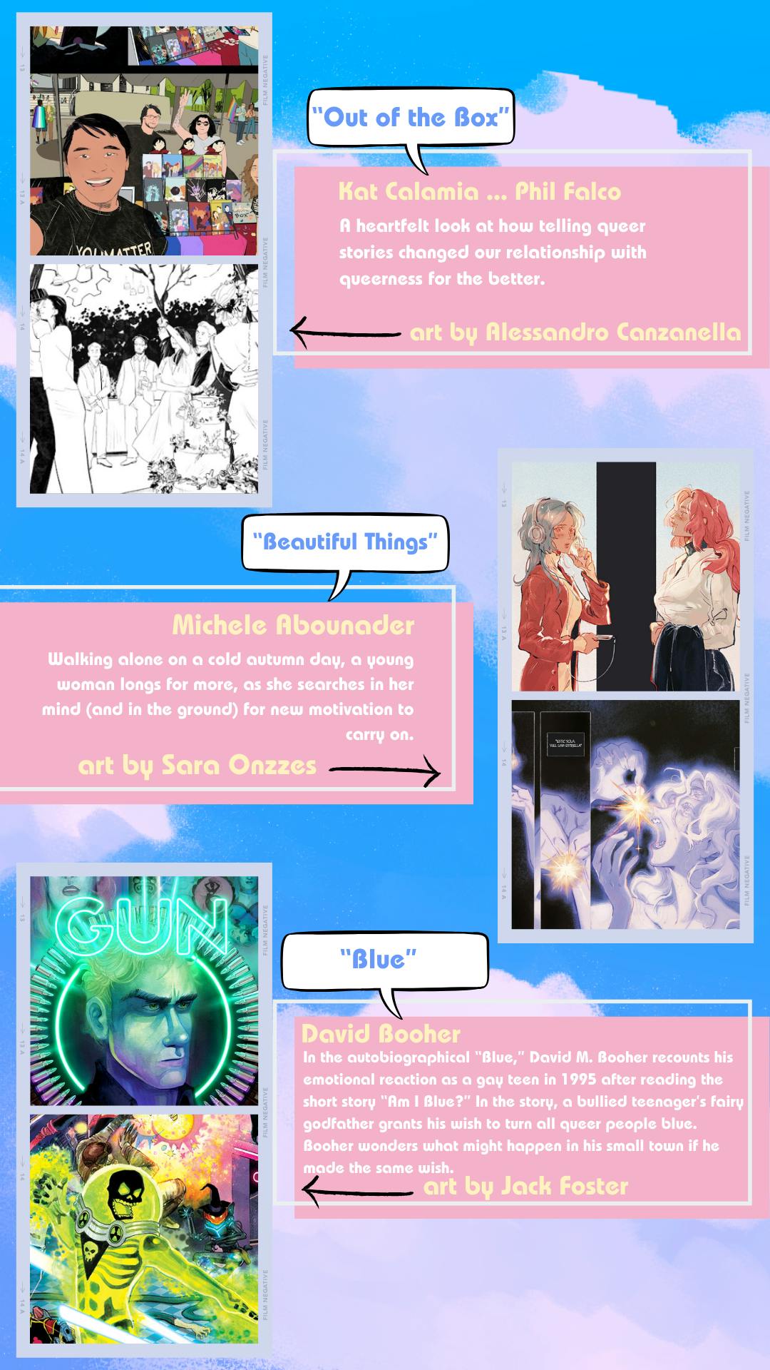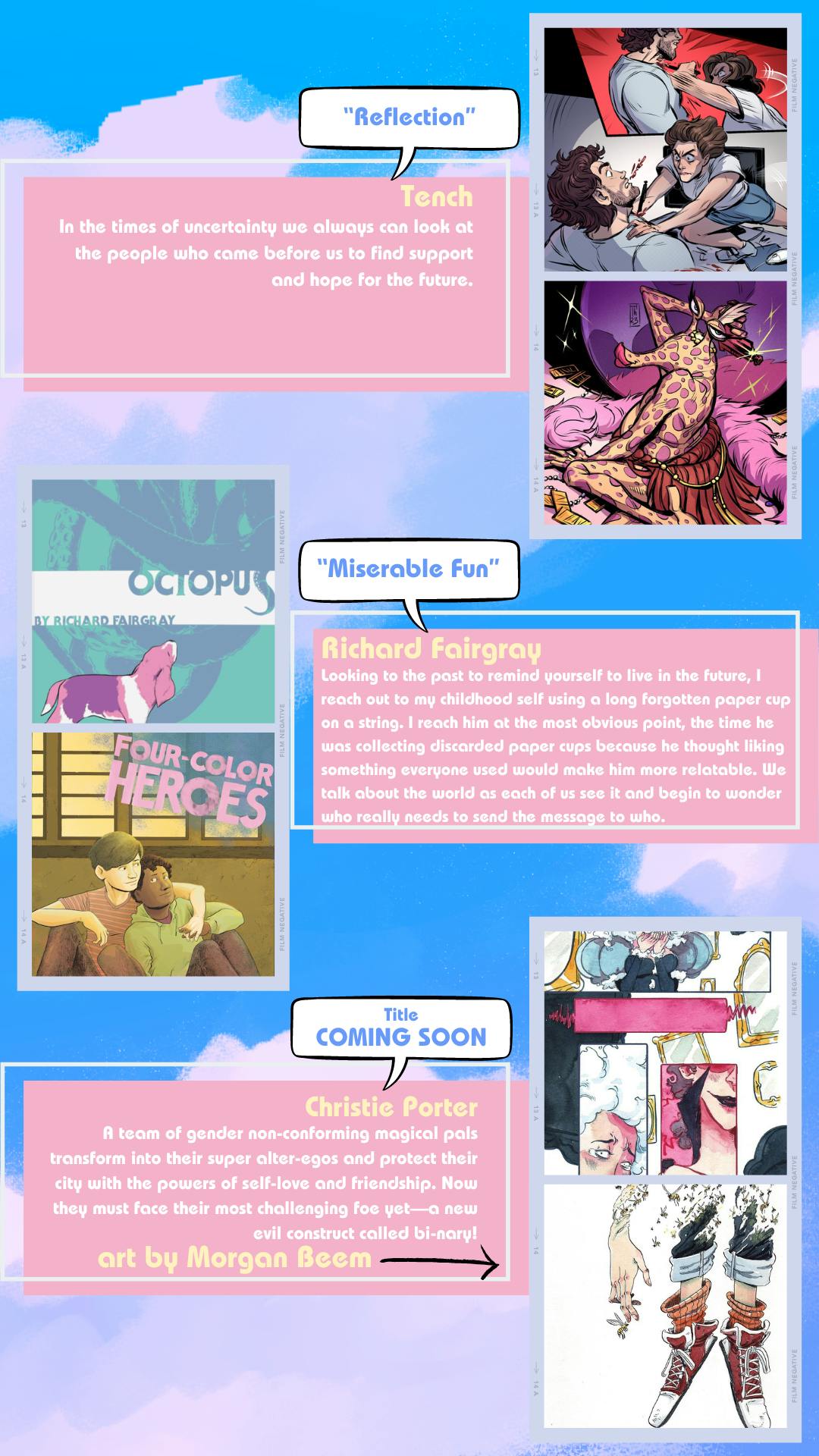 A 100+ page comic anthology featuring short stories of inspiration, advice, and triumph. All profits will be donated to The Trevor Project to benefit LGBTQIA+ youth.