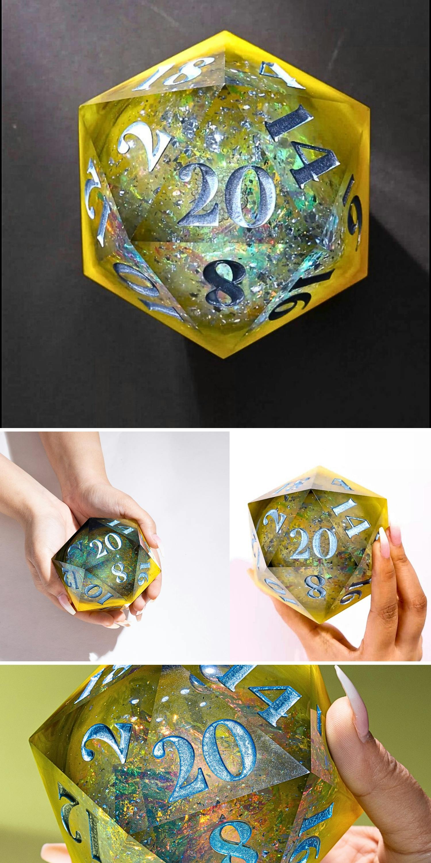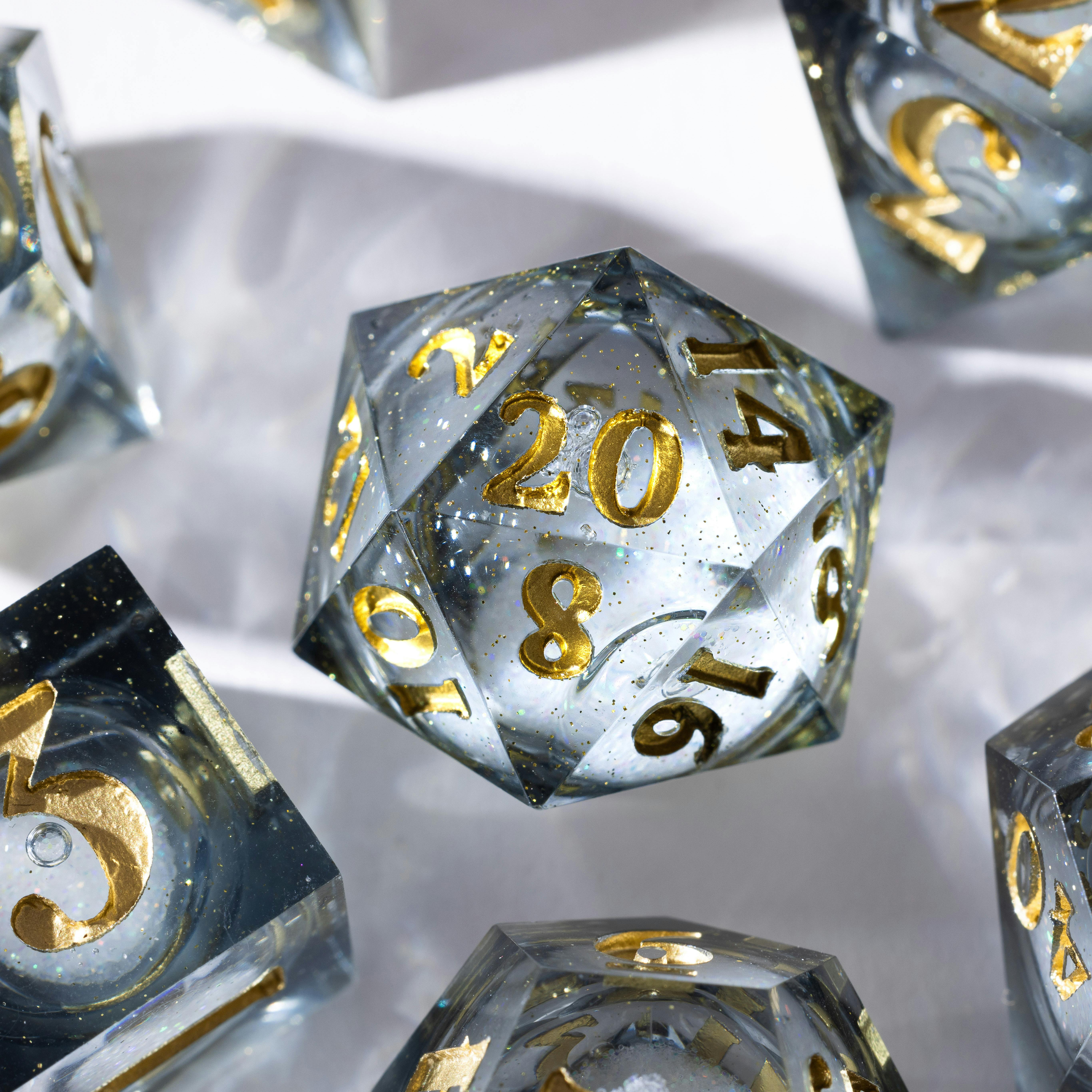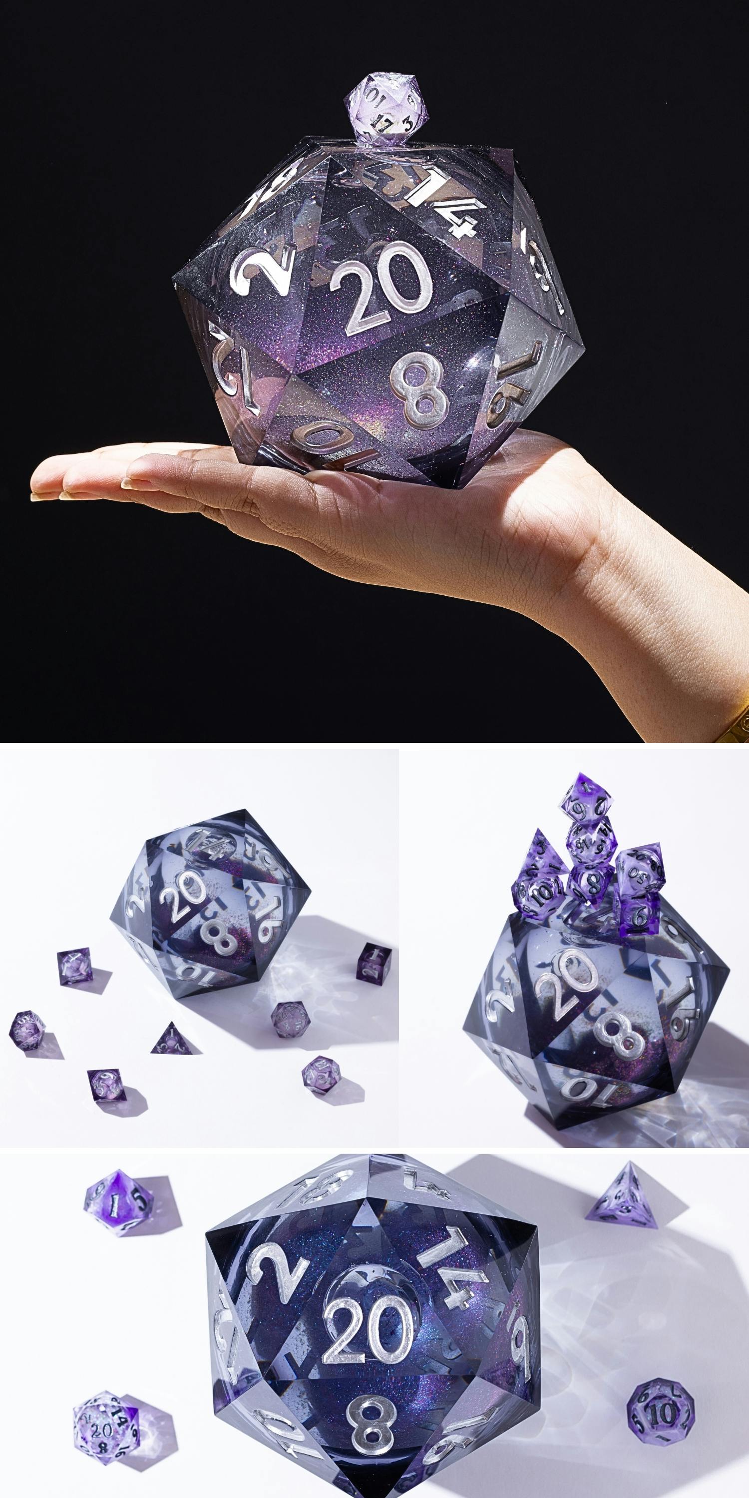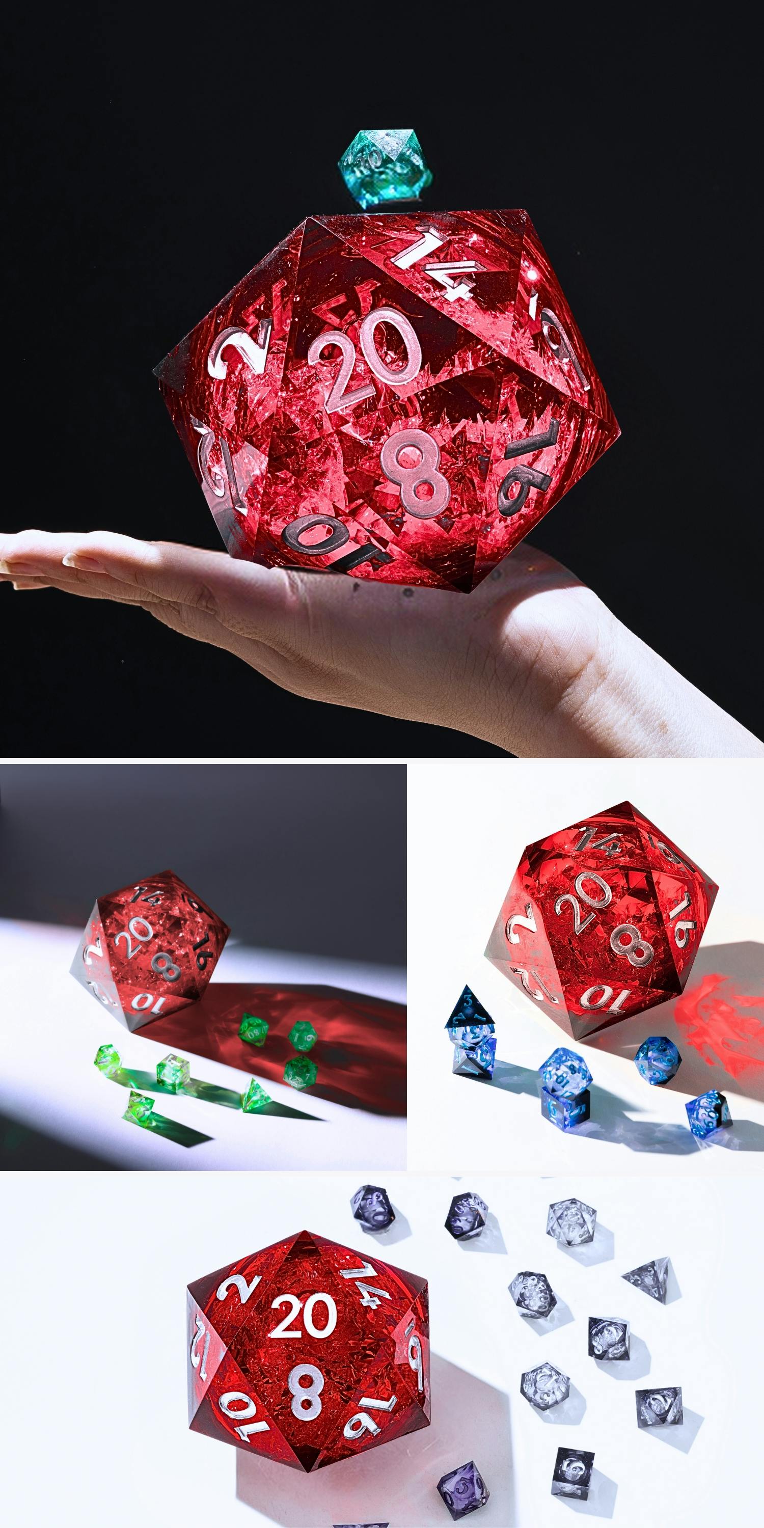 These D20s are the largest we have ever made, featuring unique liquid cores. This luxurious collection is visually stunning and will leave you and others in awe of its scale and size.
