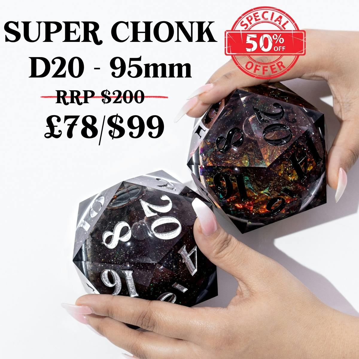 Prepare to be awed! These dice are not just big, they are enormous! We present to you our glorious super chonk D20's. These cosmic-inspired dice are designed to impress, with a massive size of 90mm. They will undoubtedly dominate any dice collection and leave any onlooker in awe! Go bigger with our stunning super chonk selection!!